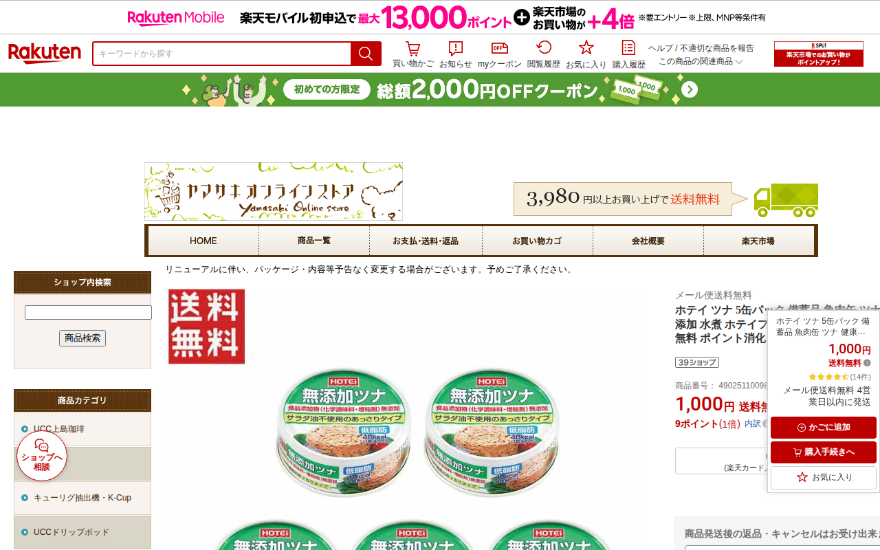 このページはホテイフーズのツナ缶5缶パックを販売する楽天市場の商品ページです。きはだまぐろをフレーク状にし、食塩のみで仕上げた国内製造の無添加水煮ツナで、1,000円送料無料です。低脂肪で健康志向の消費者に適しており、メ...