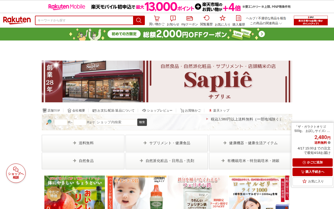 このページは、楽天市場で販売されているサプリエの「ザ・ガラクトオリゴ 500g」の商品紹介ページです。2,480円(送料無料)のオリゴ糖シロップ製品で、ショ糖やブドウ糖を使用しない高純度の国産ガラクトオリゴ糖です。腸内フ...