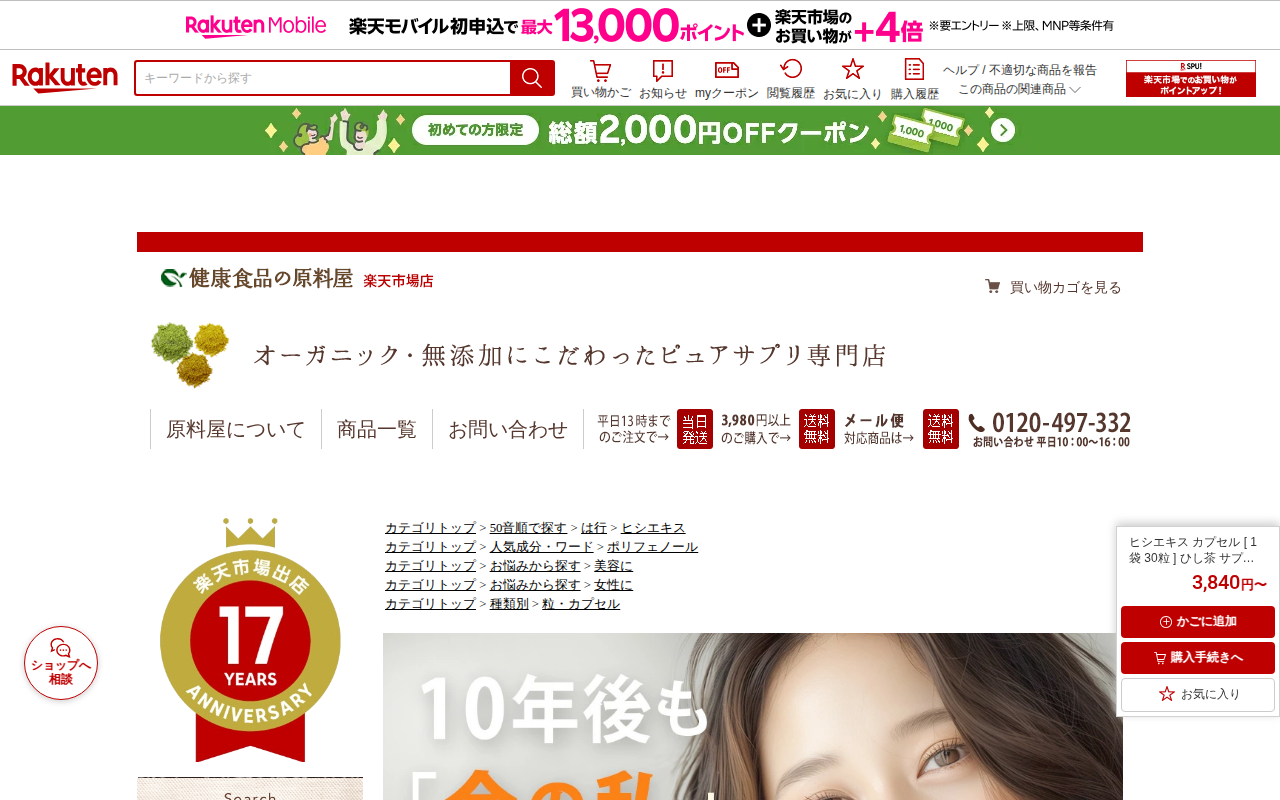 このページは、楽天市場で販売されているヒシエキス カプセルの商品紹介です。1袋30粒で、1粒にヒシ茶約10杯分の成分を凝縮したサプリメントです。糖質と体内タンパク質の結合による「糖化」に着目し、AGEsによる肌のくすみや...