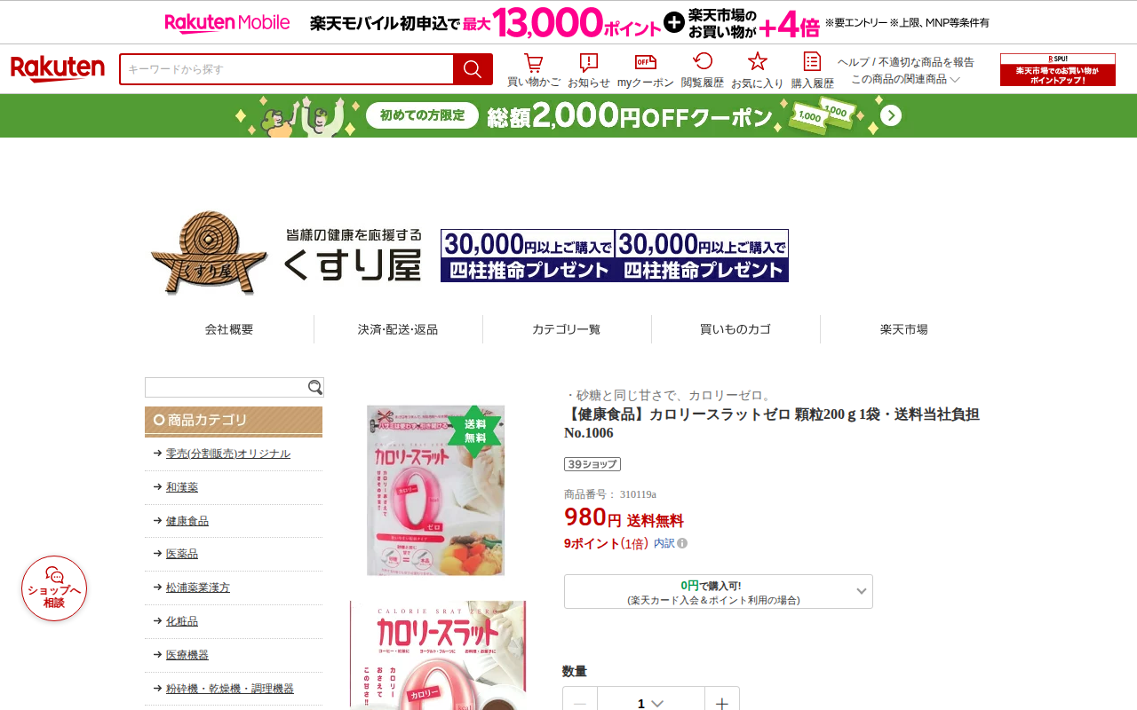 このページは、楽天市場で販売されている「カロリースラットゼロ顆粒200g」の商品ページです。価格は980円で送料無料。主原料はエリスリトールとスクラロースで、砂糖と同じ甘さながらカロリーゼロの健康食品です。天然甘味料で虫...