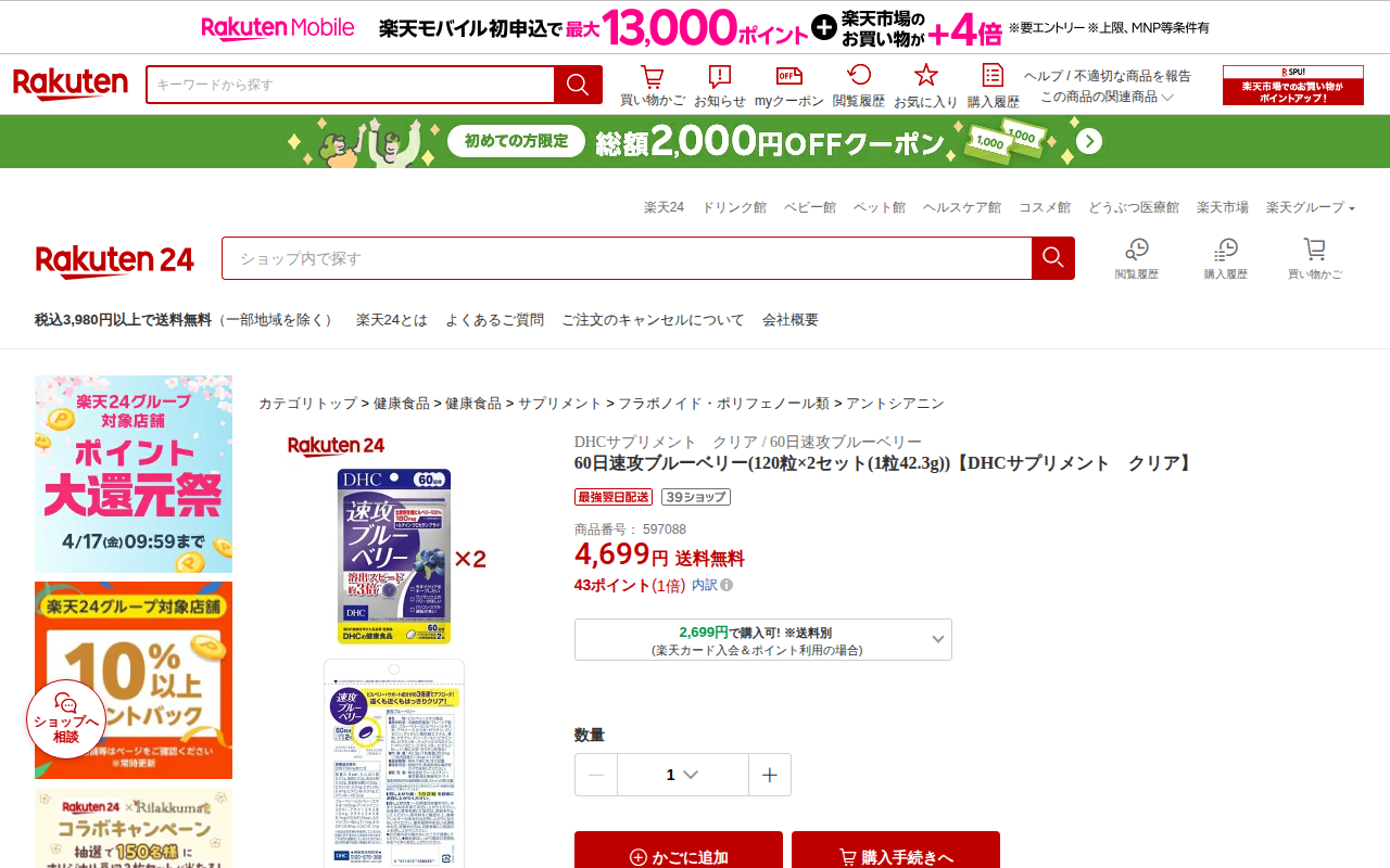 このページはDHCのブルーベリーサプリメント「60日速攻ブルーベリー」の商品情報ページです。120粒×2セット入りで4,699円、送料無料です。北欧野生種ビルベリーを100%使用し、従来品より約3倍速い溶出を実現していま...