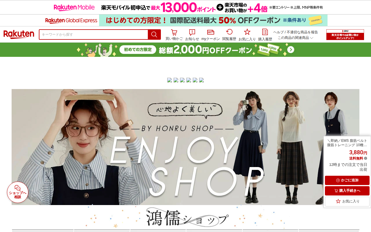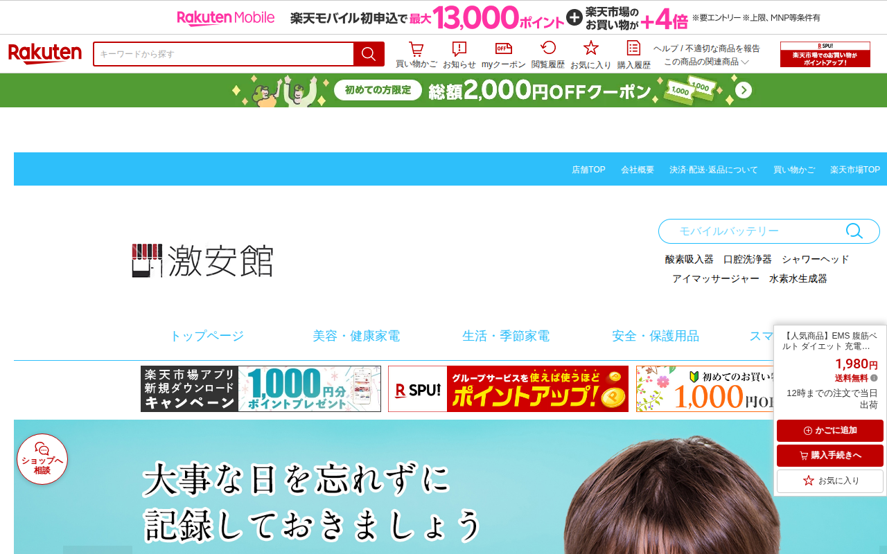 このページは、楽天市場で販売されているEMS腹筋ベルトの商品ページです。価格は1,980円で送料無料、12時までの注文で当日出荷されます。10段階調節、6モードの振動機能を備え、USB充電式で男女兼用です。微小電流パルス...