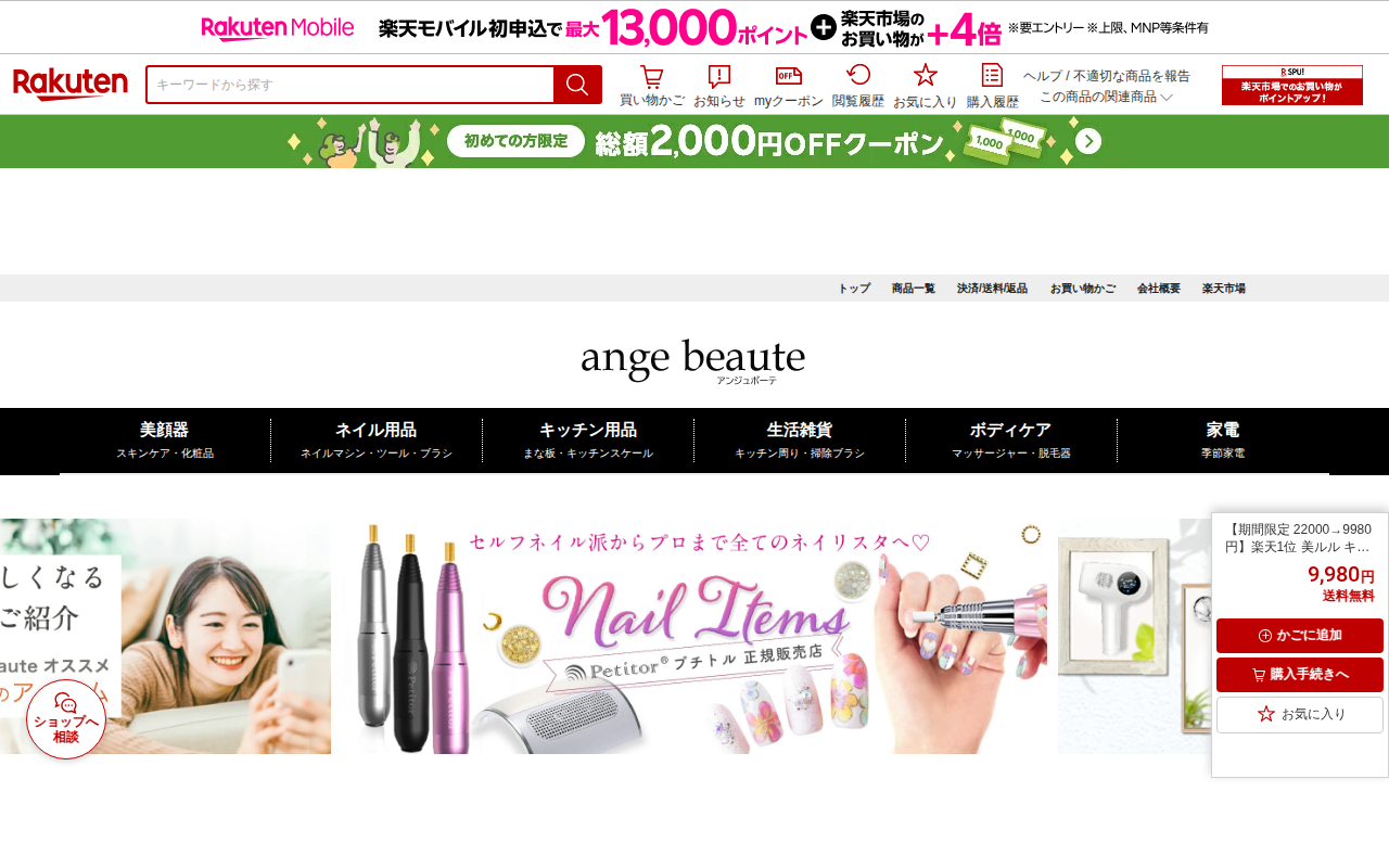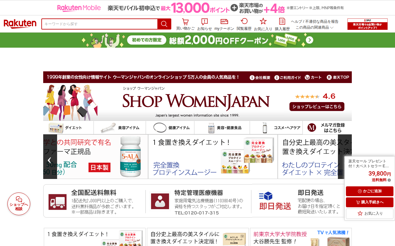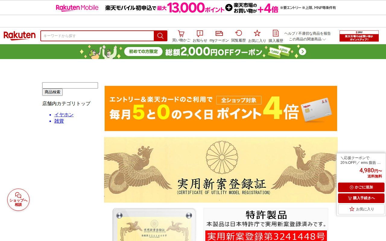 このページは、楽天市場で販売されている特許取得済みのEMS美容機器「シェイプメイト」の商品ページです。充電式コードレスタイプで、メーカー希望小売価格83,600円のところ39,800円で販売されています。1,600件以上...