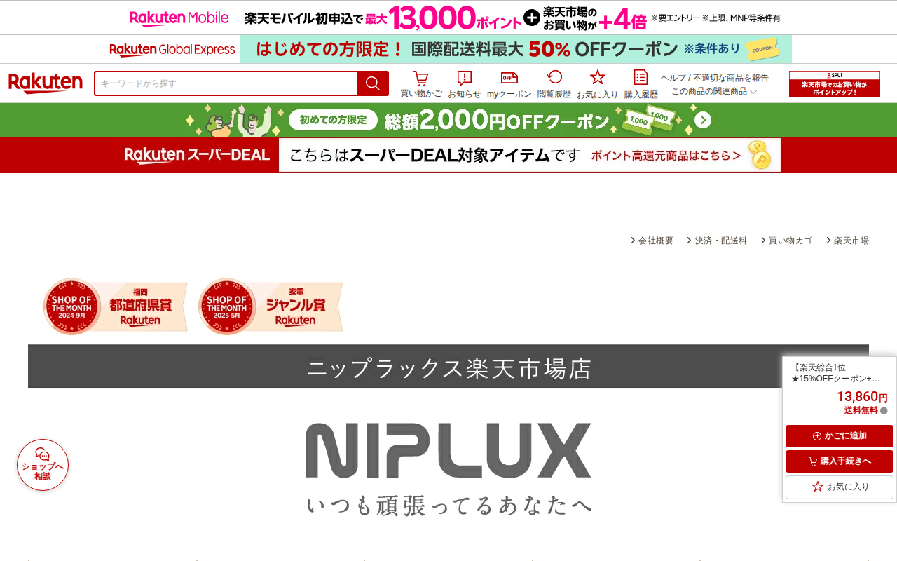 このページは、楽天市場で販売されている「NIPLUX NECK RELAX 1S」という首・肩ケア用の電気刺激マッサージ機の商品紹介ページです。グッドデザイン賞受賞製品で、EMS(電気刺激)と温熱機能を備えています。6枚...