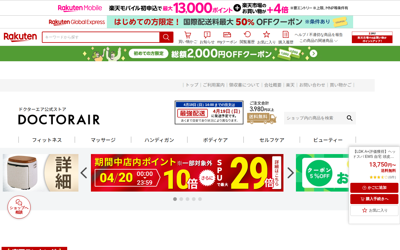 このページは、楽天市場で販売されているドクターエアのEMSスカルプスパ BSC-01の商品ページです。LDK A+評価を獲得した電動ヘッドスパで、自宅での頭皮ケアに使用できます。EMS機能と赤色LED機能を搭載し、防水設...