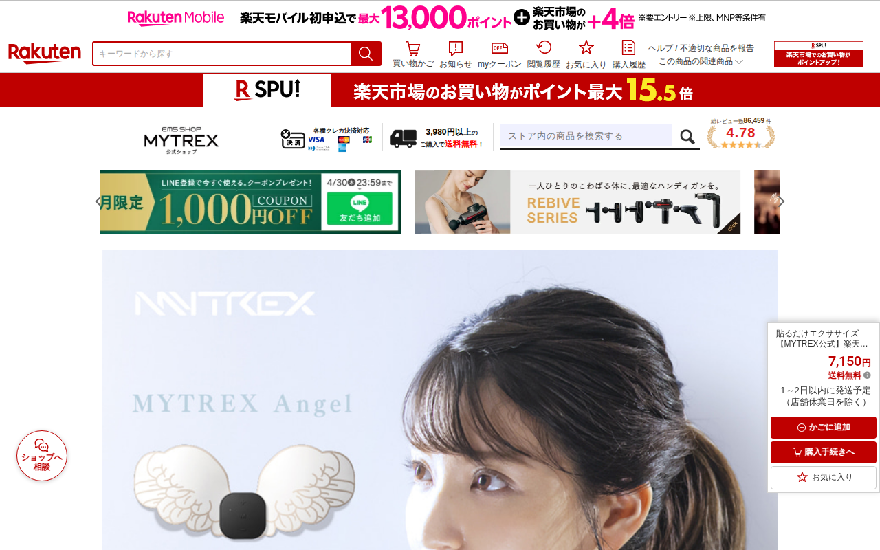 このページはMYTREX公式ストアの楽天市場出店で販売されている貼るタイプのEMS運動補助器「エンジェル」の商品ページです。価格は7,150円で送料無料、1~2日以内に発送予定です。腹部、腕、太もも、ヒップなど複数の部位...