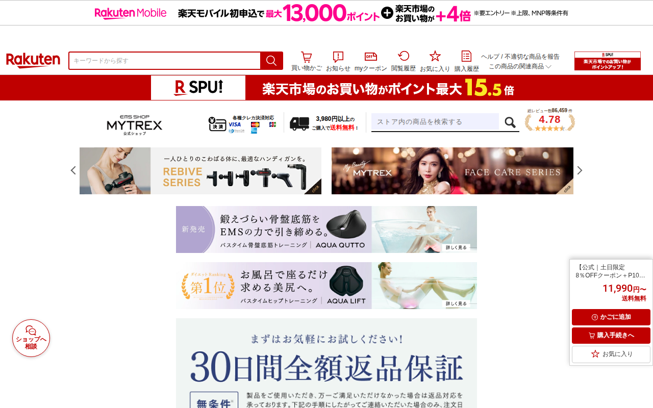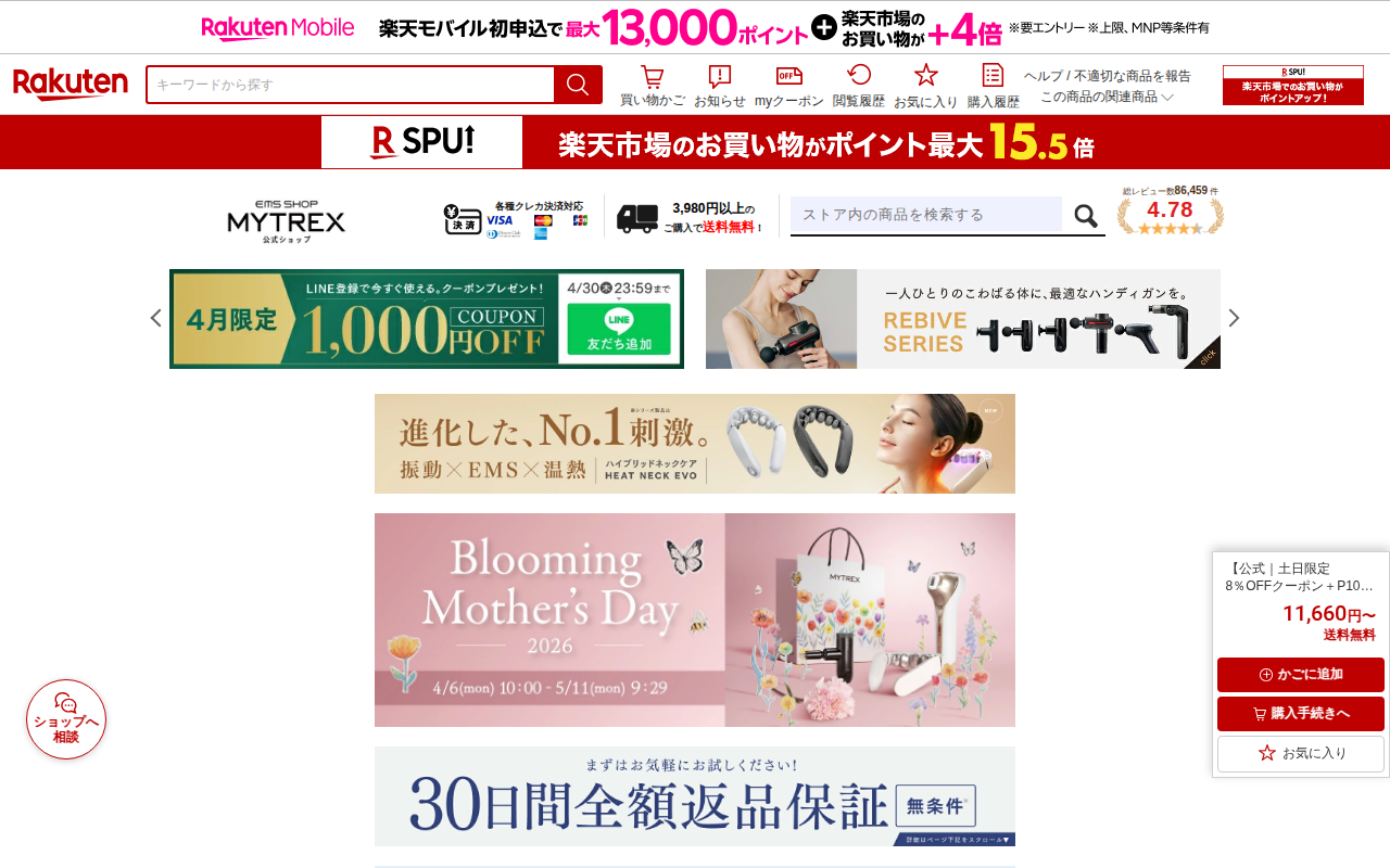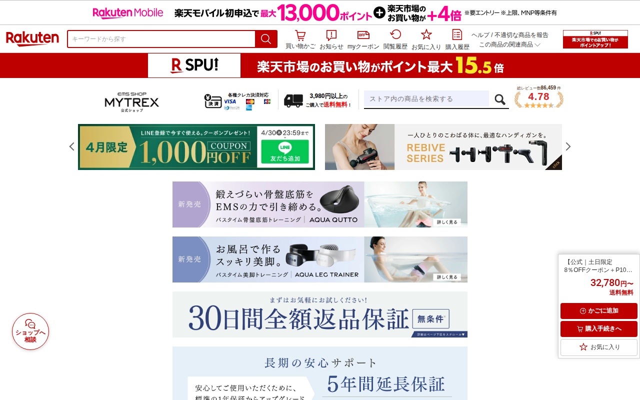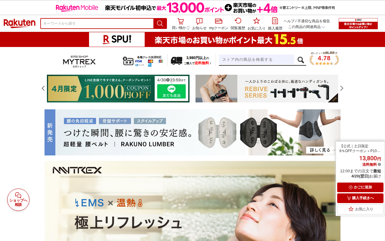 このページはMYTREX EMS HEAT STRETCHという腰用サポーターベルトの販売ページです。楽天市場で1位の商品で、価格は13,800円。EMS機能と温熱機能を組み合わせ、筋肉エクササイズと温めで腰をリフレッシ...