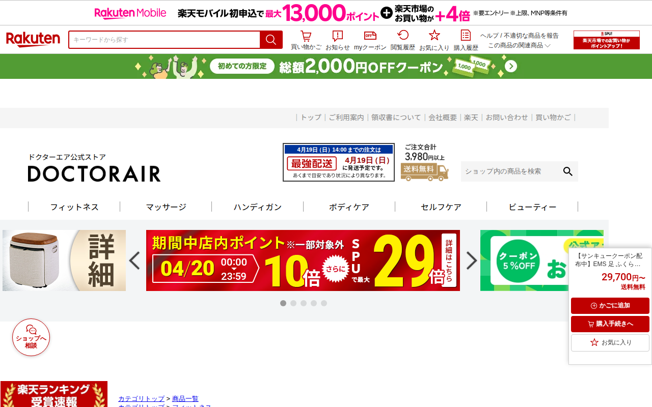 このページはドクターエア公式の楽天市場店で販売されている「フットケア プレミアム」という足用健康機器の商品ページです。EMS電気刺激、振動、温熱機能を備え、足裏やふくらはぎ、太もものトレーニングに対応しています。価格は2...