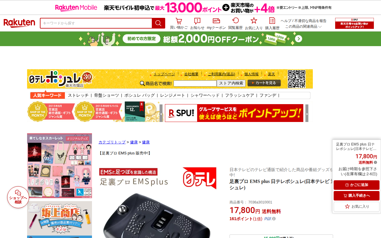 このページは、日本テレビの通販番組『ポシュレ』で紹介された「足裏プロ EMS plus」を販売する楽天市場の商品ページです。足つぼの専門家・與那嶺茂人氏が開発した脚トレーニングマシーンで、17,800円(送料無料)で購入...