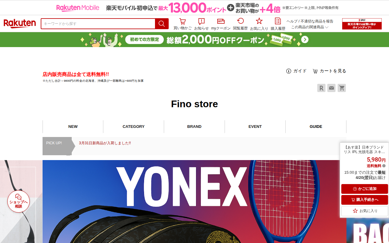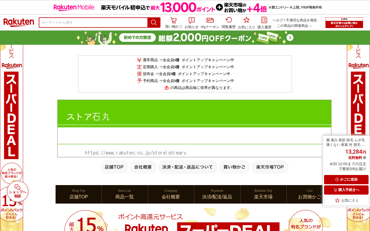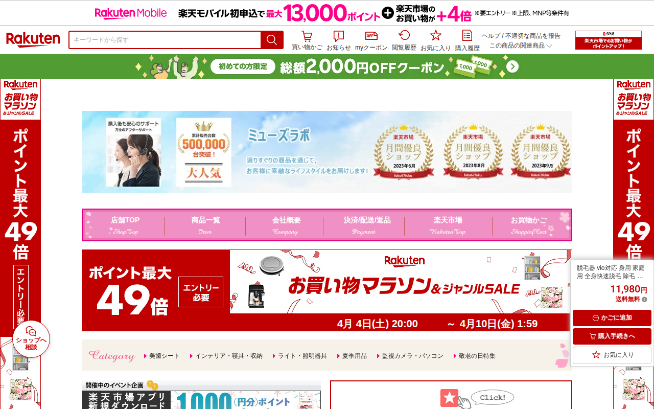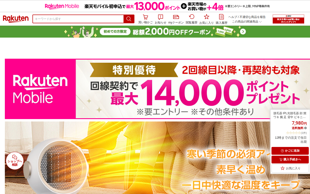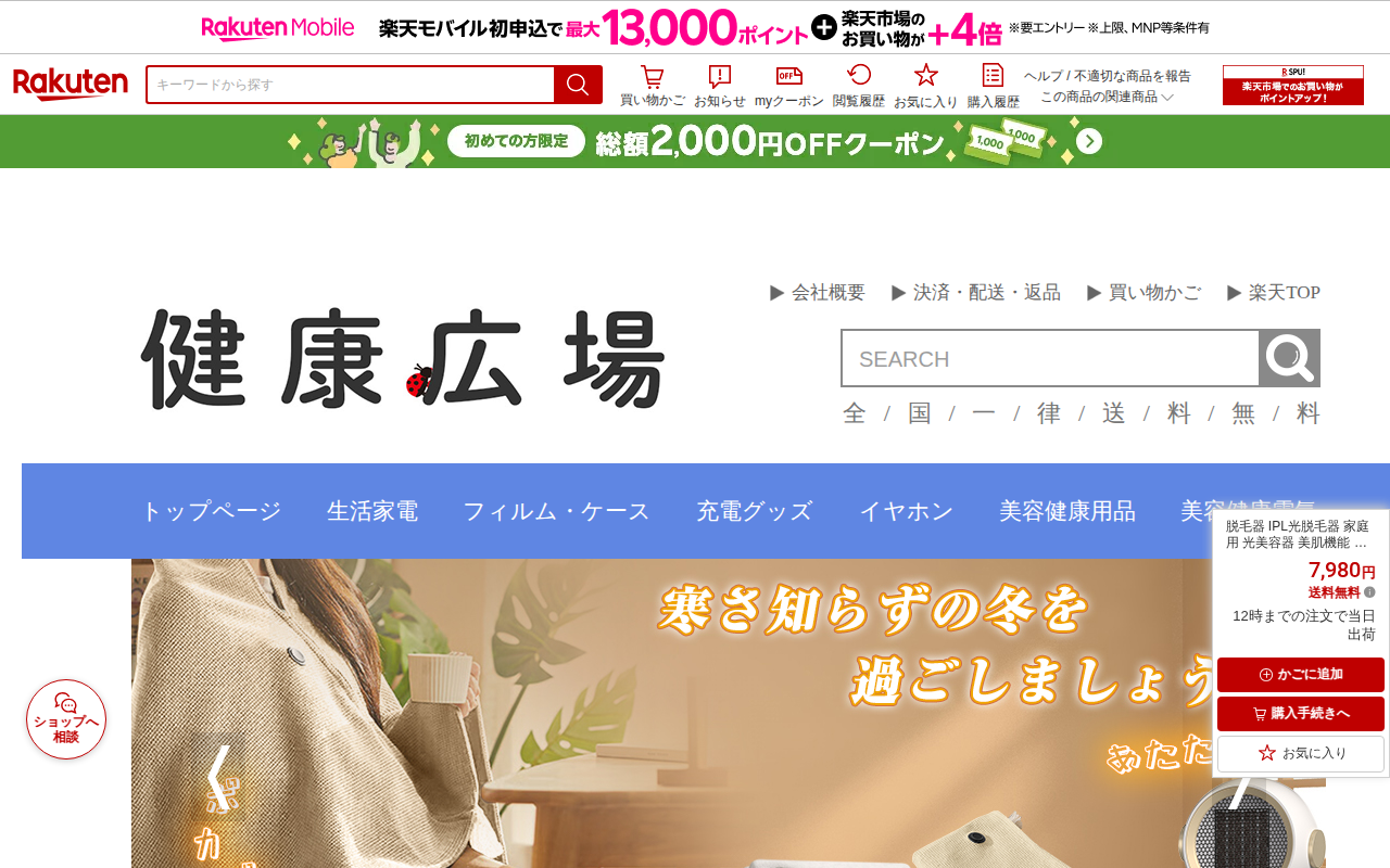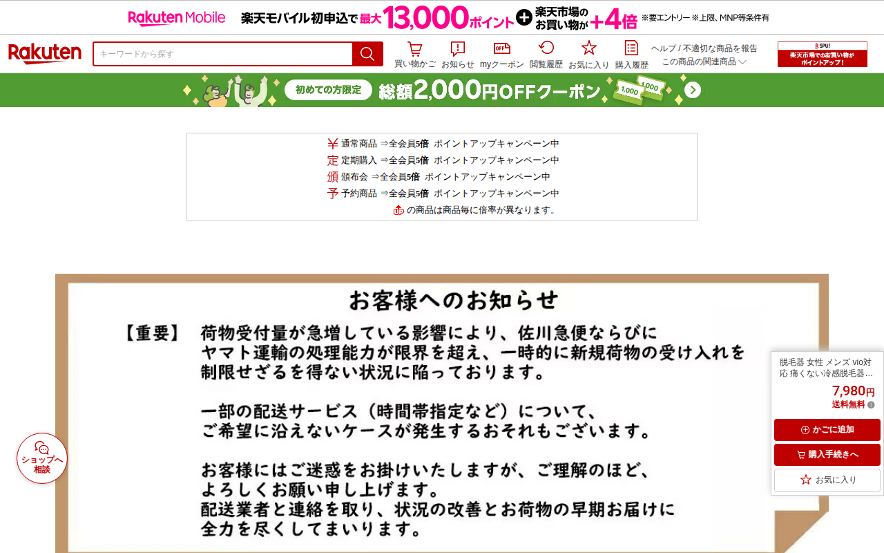 このページは、楽天市場で販売されているIPL光脱毛器の商品ページです。メーカー希望小売価格15,960円から50%割引の7,980円で販売されており、送料無料です。顔、髭、脇、腕、足、背中、ビキニラインなど全身のムダ毛処...