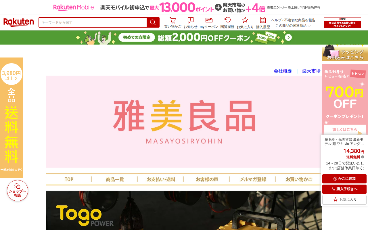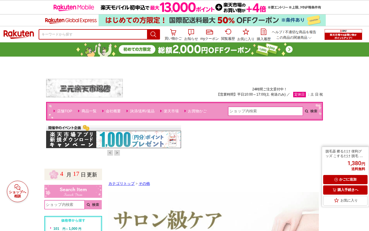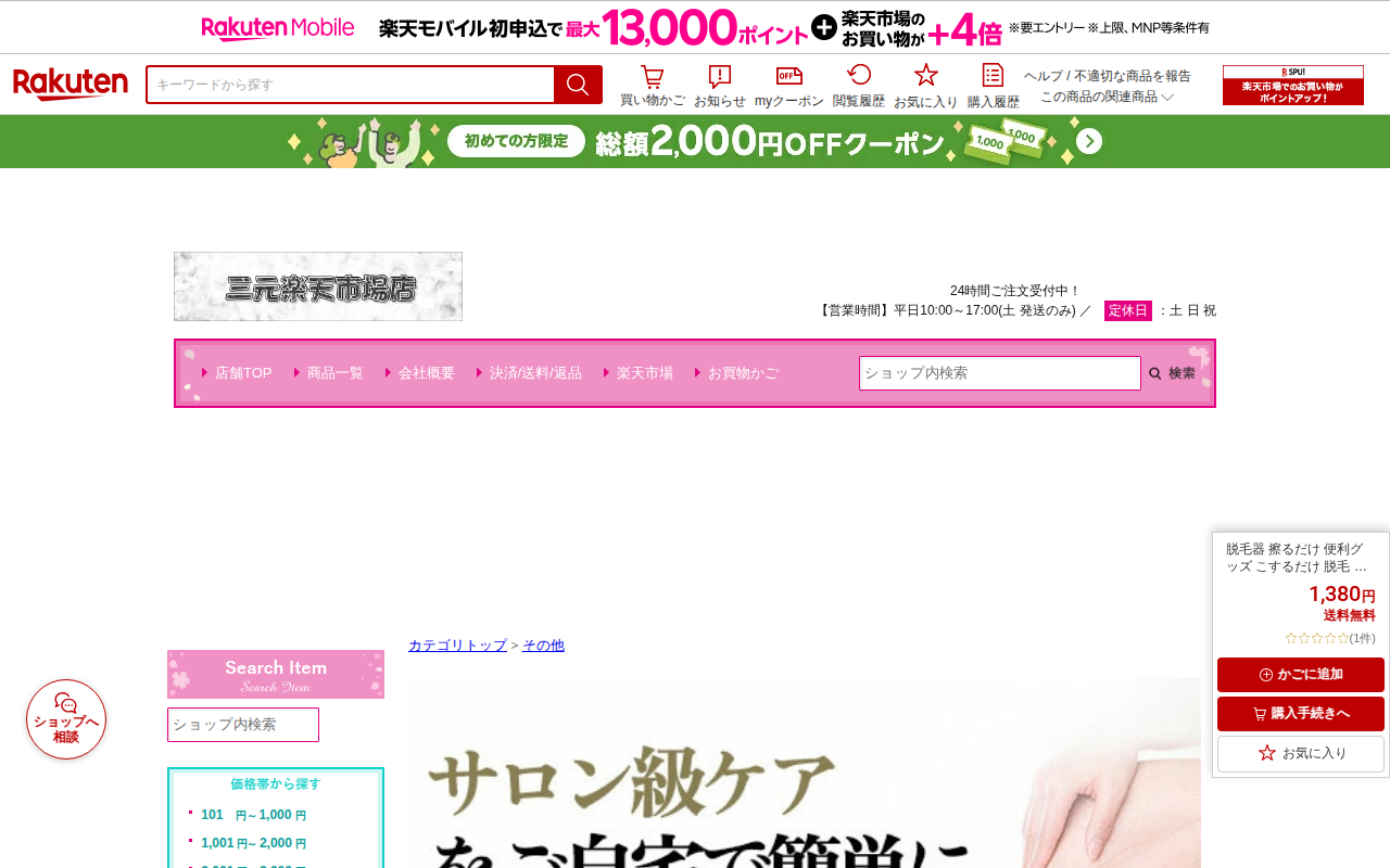 このページは、楽天市場で販売されている家庭用脱毛器の商品ページです。擦るだけで除毛できる便利グッズで、1,380円で送料無料となっています。顔、腕、足、脇、背中など全身に対応し、痛くない設計で、女性から男性、子供まで使用...