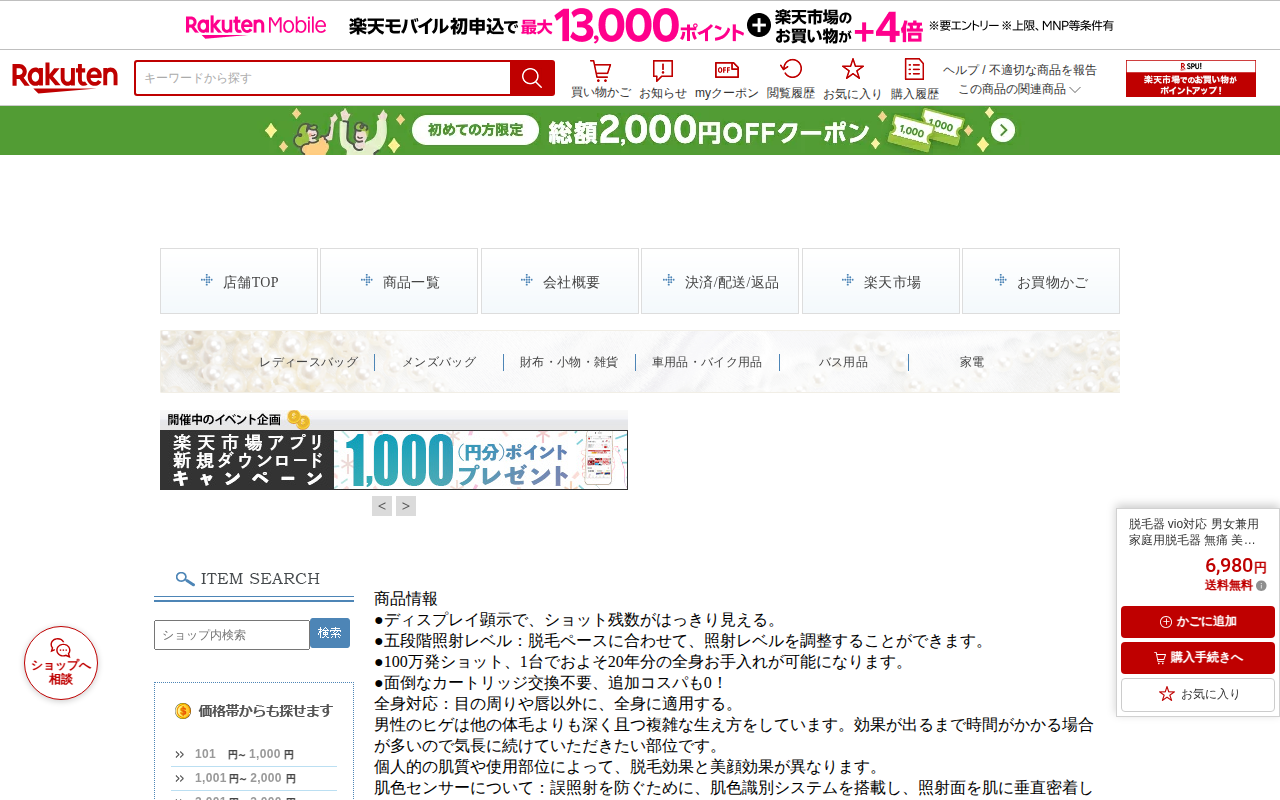 このページは、楽天市場で販売されているIPL光脱毛器の商品紹介ページです。価格は6,980円で送料無料。男女兼用で、VIO対応の家庭用脱毛器で、99万発の照射が可能です。五段階の照射レベル調整機能があり、約20年分の全身...