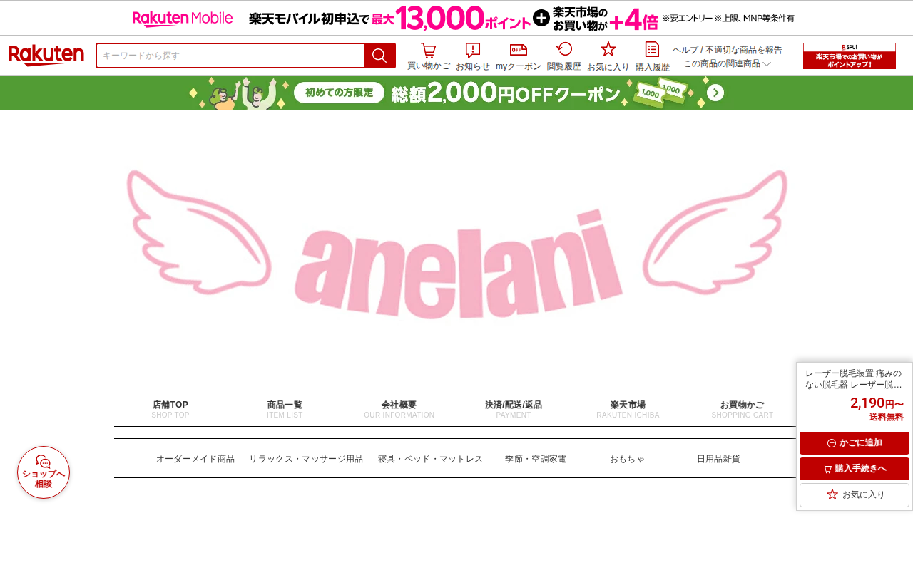 このページは、楽天市場で販売されている家庭用レーザー脱毛器の商品ページです。痛みのない脱毛が可能で、男女兼用で全身のボディ、顔、ひげ、脇など様々な部位に対応しています。USB充電式のポータブル脱毛ツールで、価格は2,19...
