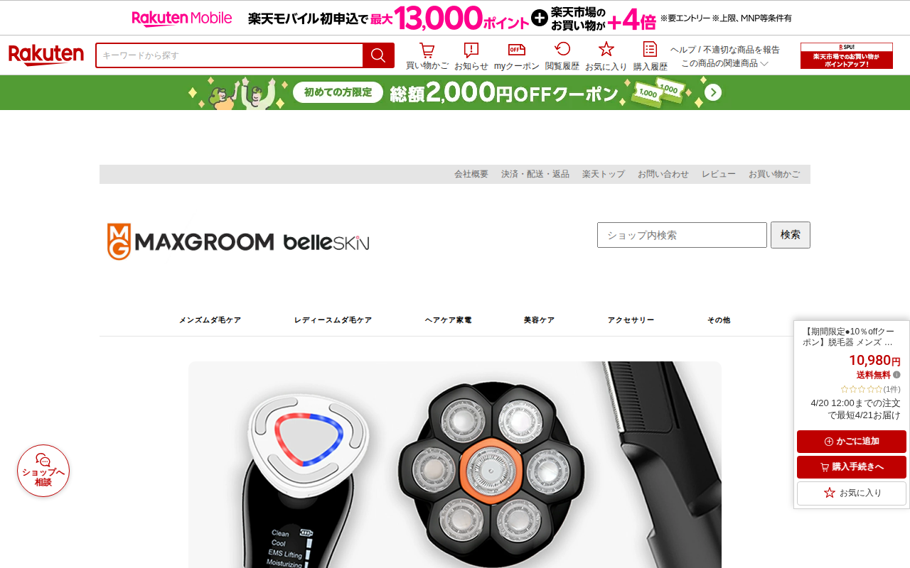このページはMAXGROOM公式ストアが楽天市場で販売している家庭用脱毛器の商品ページです。メンズ・レディース両対応のIPL光脱毛器で、最大出力21J、最速0.6秒の自動連射機能により約8分で全身脱毛が可能。冷却機能で痛...
