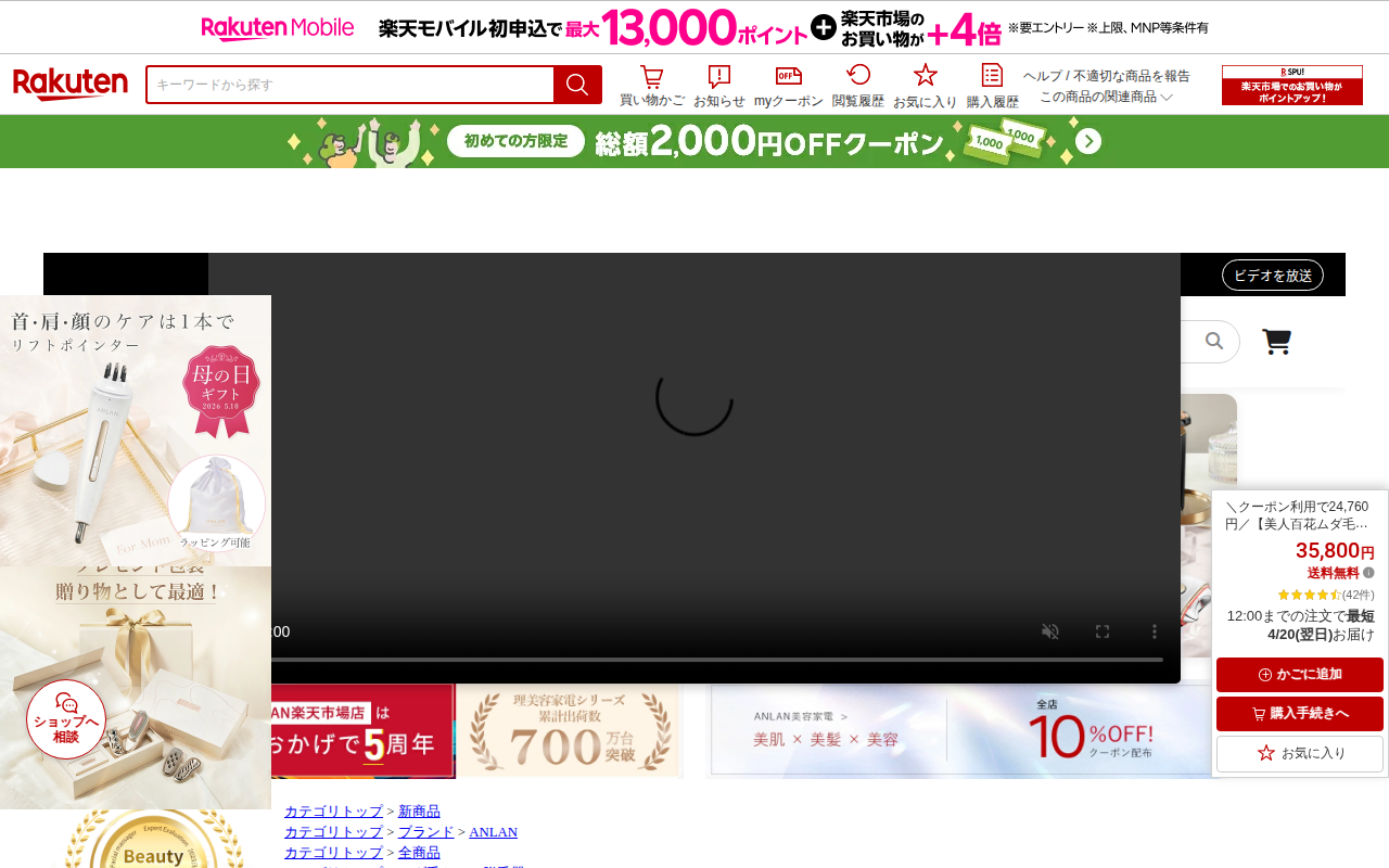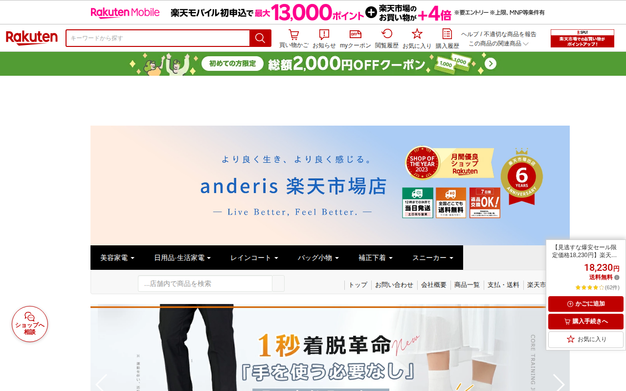 このページは、楽天市場で販売されている家庭用脱毛器「ANDERIS無痛冷感脱毛器」の商品情報です。爆安セール限定価格18,230円で販売されており、100万回の照射回数を備えています。冷却機能により痛みを軽減し、敏感肌で...
