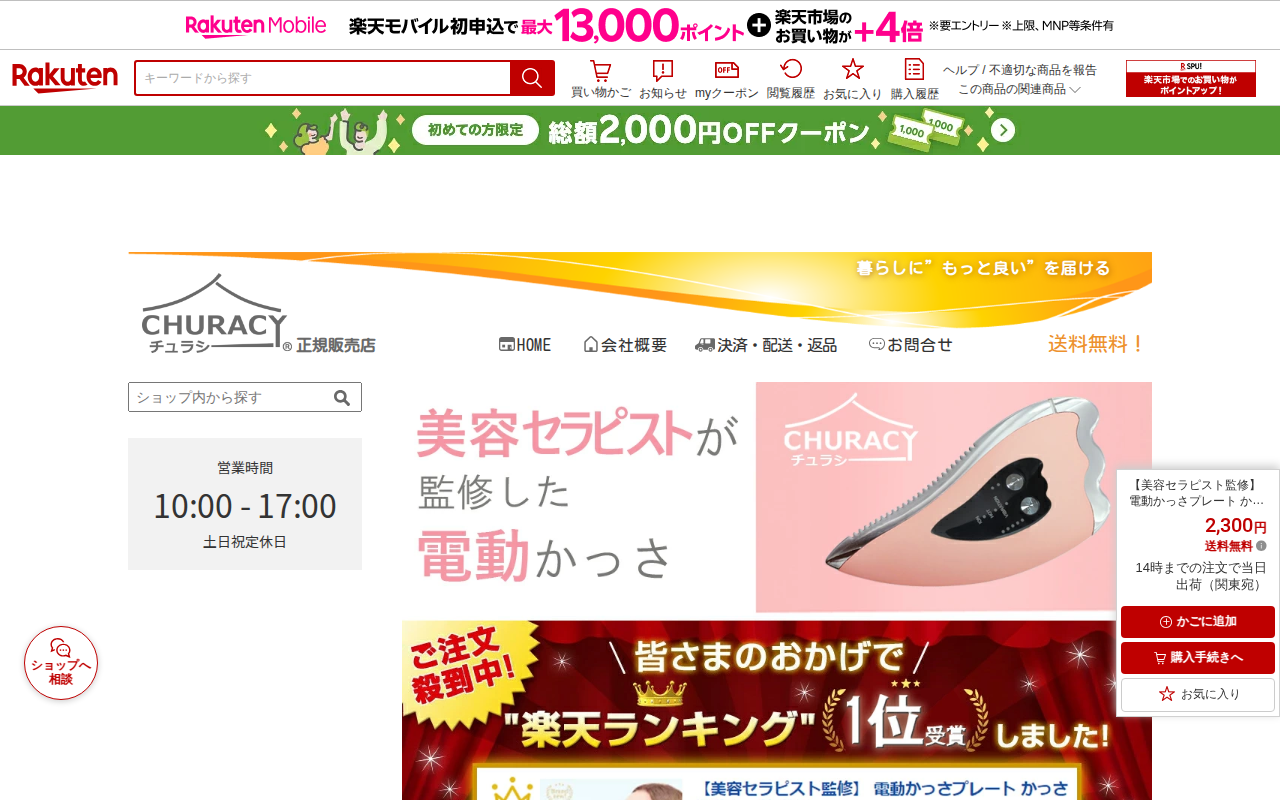 このページは、楽天市場で販売されている電動かっさプレート「CHURACY」の商品ページです。美容セラピスト監修の本商品は、振動エステ、温感エステ、イオン導入の3機能を搭載しており、顔から脚まで全身に使用できます。振動は5...