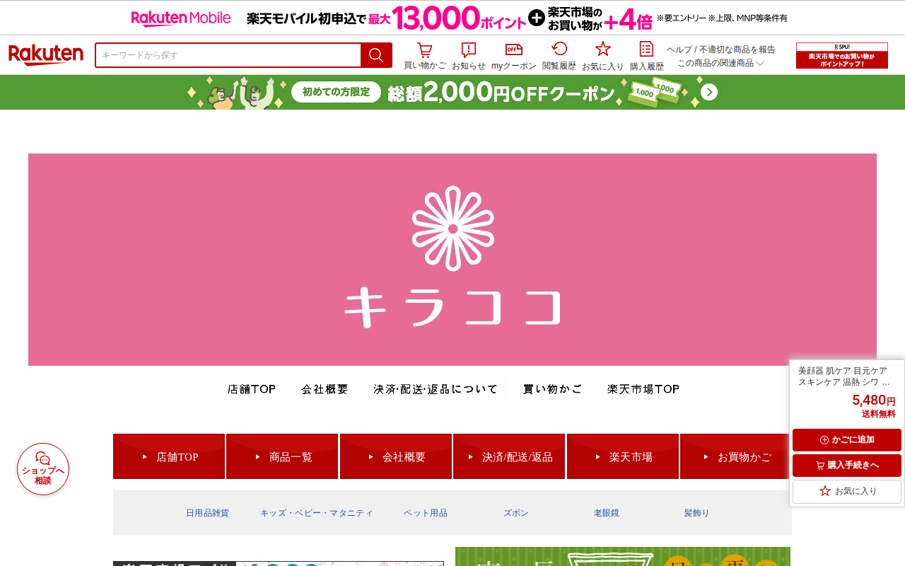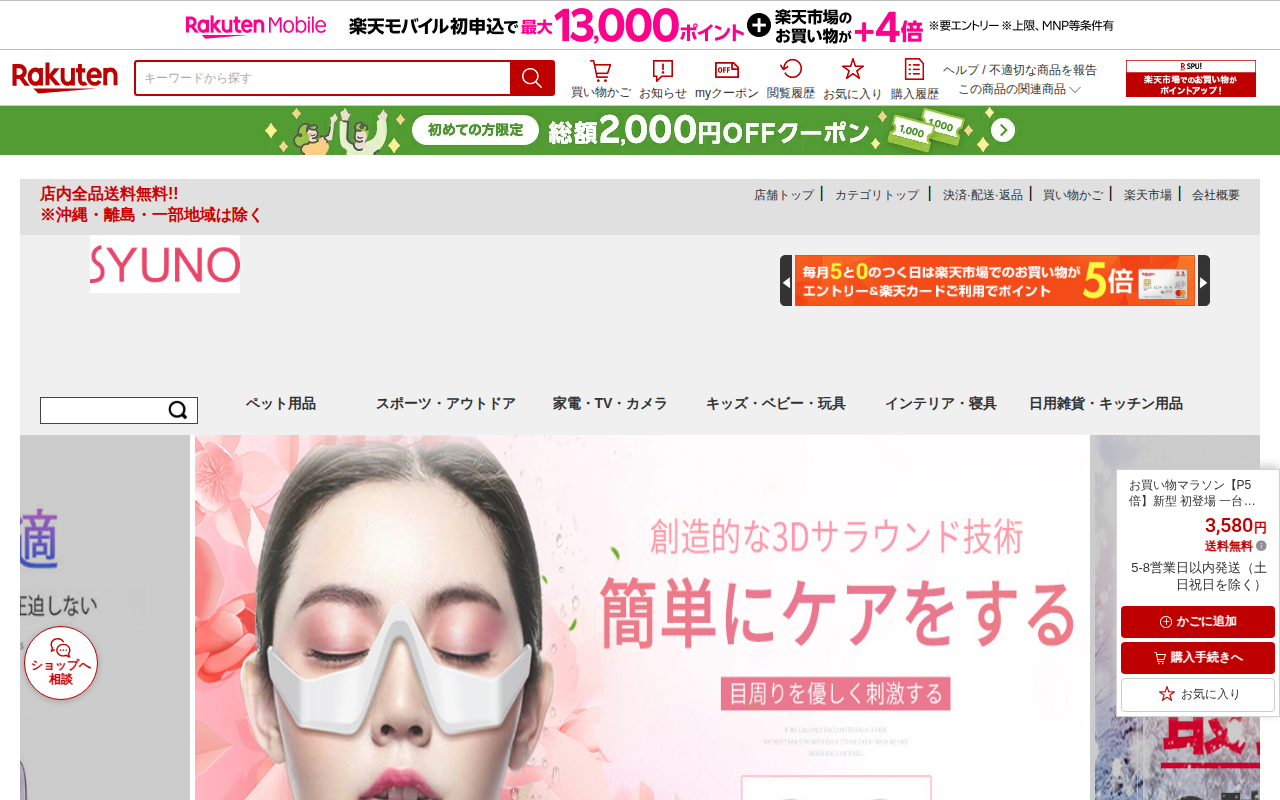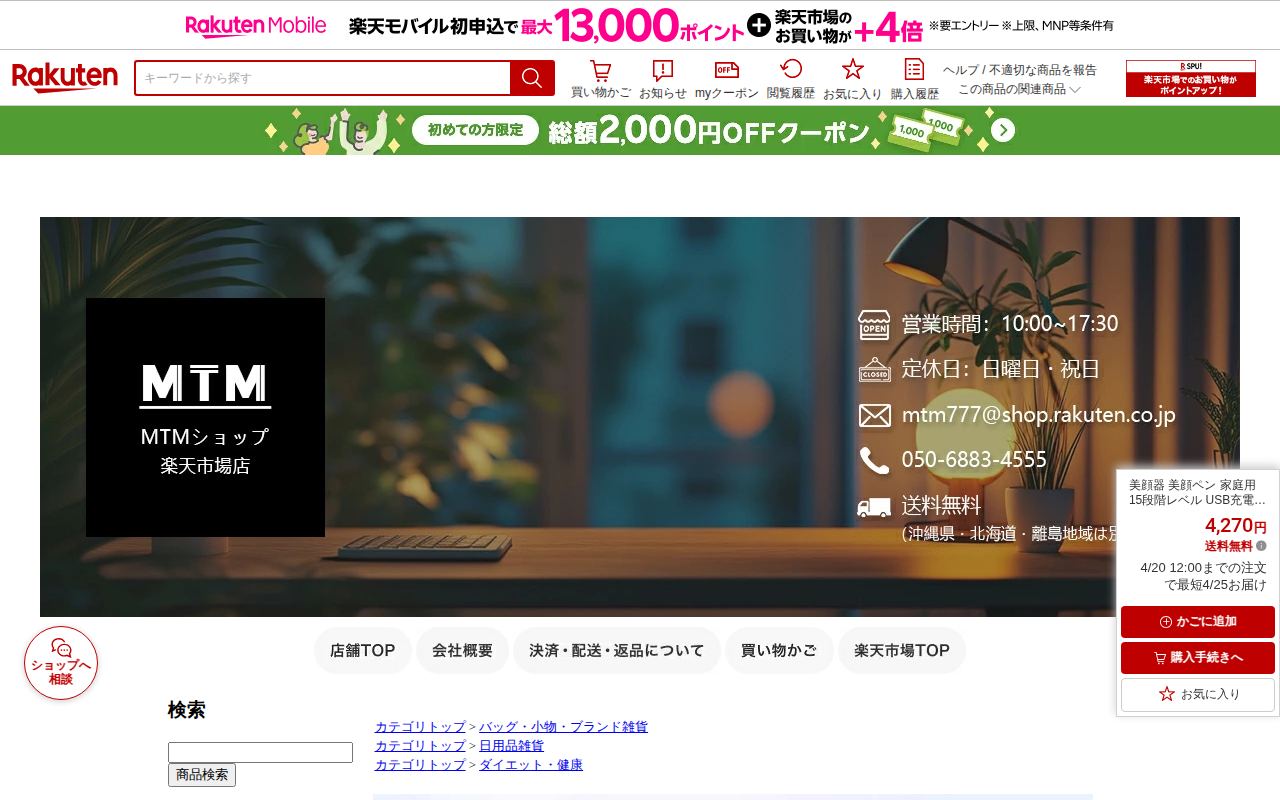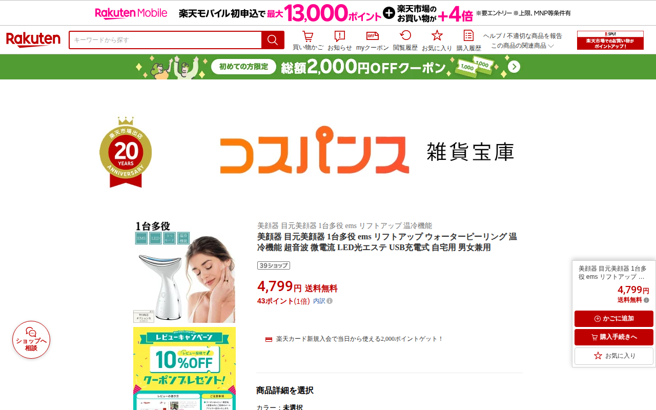 このページは、楽天市場で販売されている美顔器の商品ページです。温熱振動とイオン導入機能を備え、毛穴ケアや肌の引き締め、保湿などが可能な自宅用美顔器です。毎分10000回の高周波振動により栄養素の吸収を助けます。価格は3,...