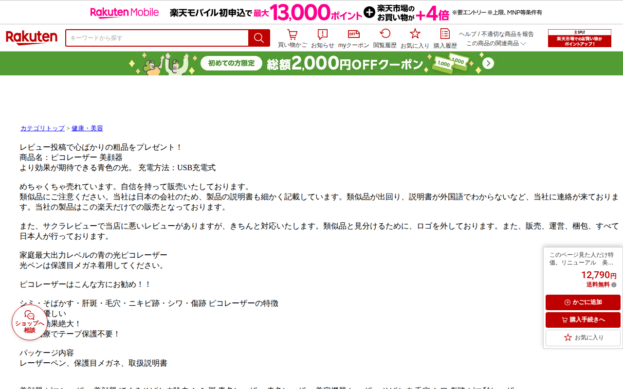 このページは楽天市場で販売されているピコレーザー美顔器の商品紹介です。価格は12,790円で送料無料。USB充電式で、青色レーザーを使用し、シミ・そばかす・毛穴・シワ・傷跡などの除去に効果が期待できます。販売元は日本の会...