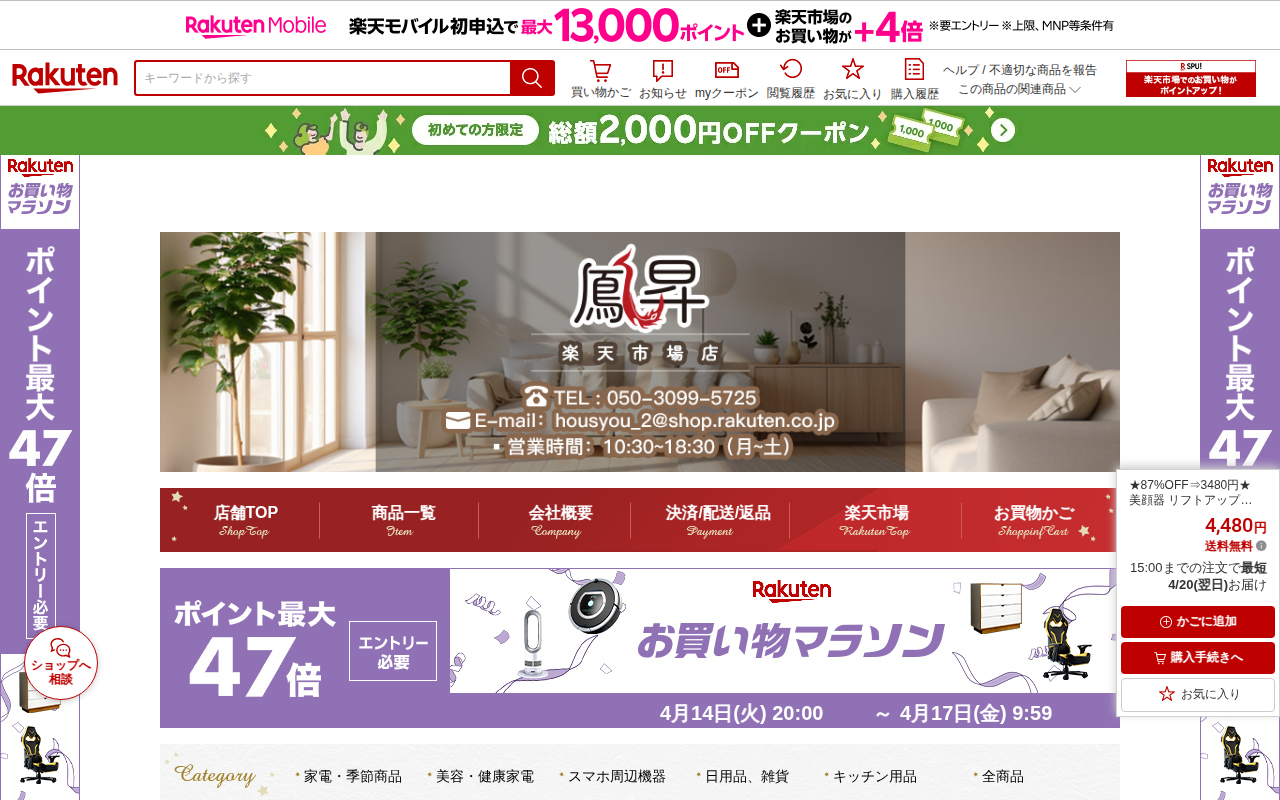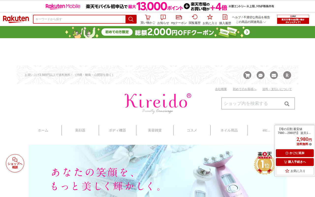 このページは、楽天市場で販売されている多機能美顔器の商品ページです。メーカー希望小売価格8,980円から87%割引された3,480円(現在4,480円)で販売されています。EMS微電流、温熱ケア、RFラジオ波、超音波、イ...
