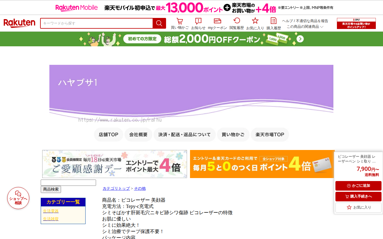 このページは、楽天市場で販売されているピコレーザー美顔器の商品ページです。Type-C充電式のレーザーペンで、シミ、そばかす、ほくろ、肝斑、毛穴、ニキビ跡、シワ、傷跡の除去に対応しています。青色レーザーと赤色レーザーの2...