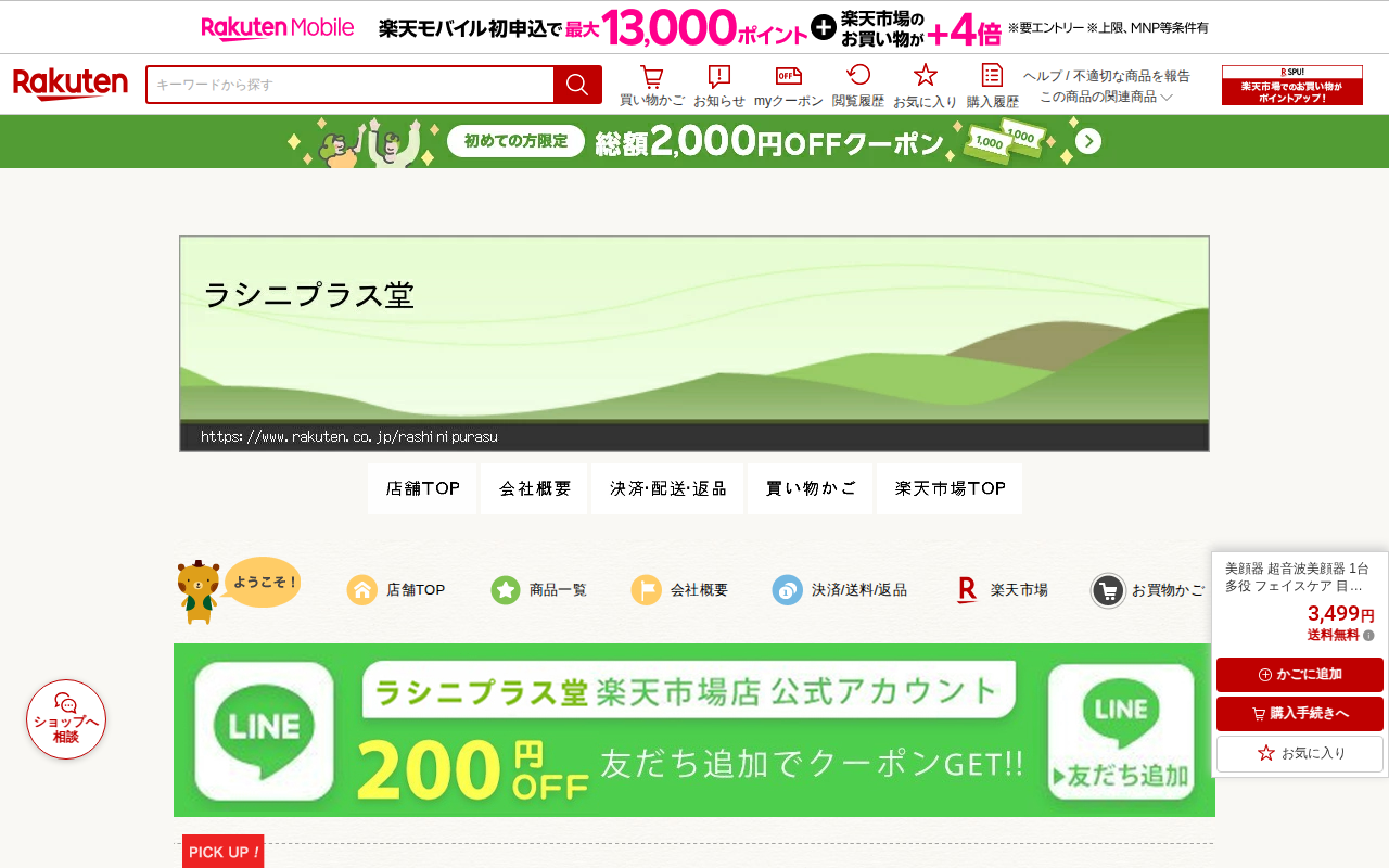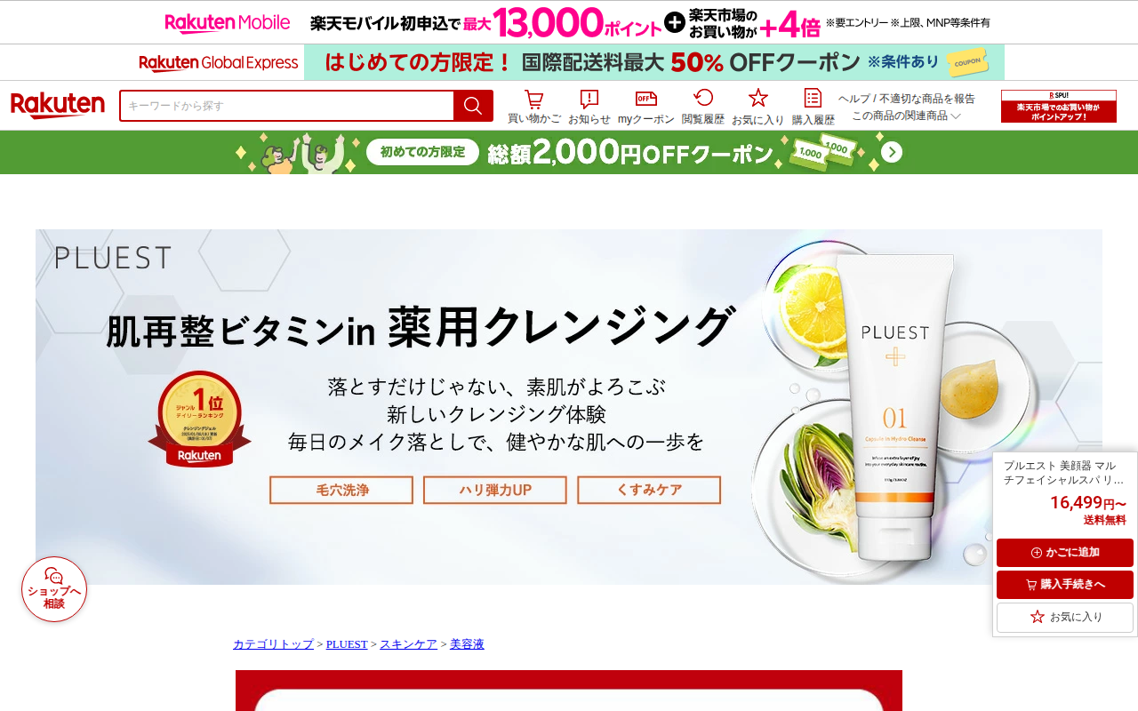 このページは、楽天市場で販売されているプルエスト製の多機能美顔器「マルチフェイシャルスパ」の商品ページです。16,499円から23,000円の価格帯で、単品またはセット販売されています。EMS、RF、LED、超音波、イオ...
