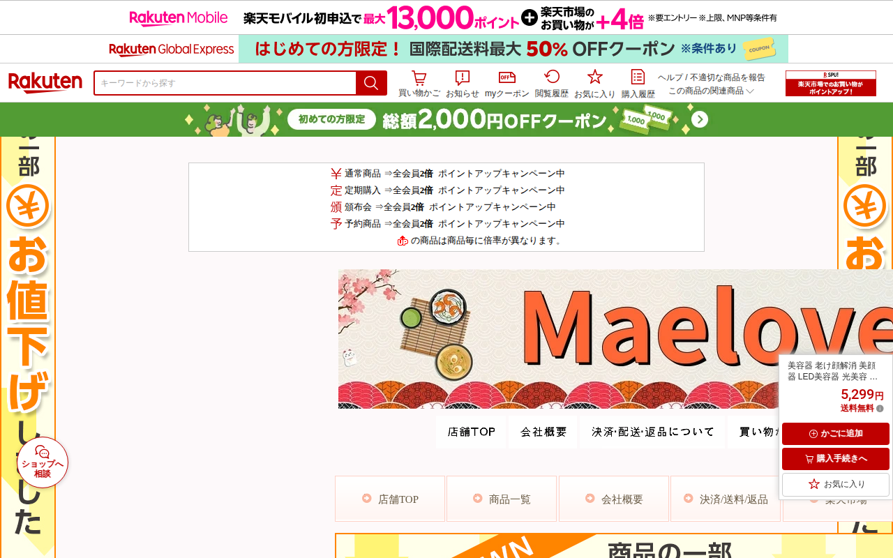 このページはMaeloveブランドのLED美容器の商品ページです。7色のナノ光波技術を搭載した多機能美顔器で、赤・青・緑・黄・薄青・オレンジ・紫の各ライトが異なる波長でお肌に浸透し、にきび除去、毛穴引き締め、美白、シワ改...