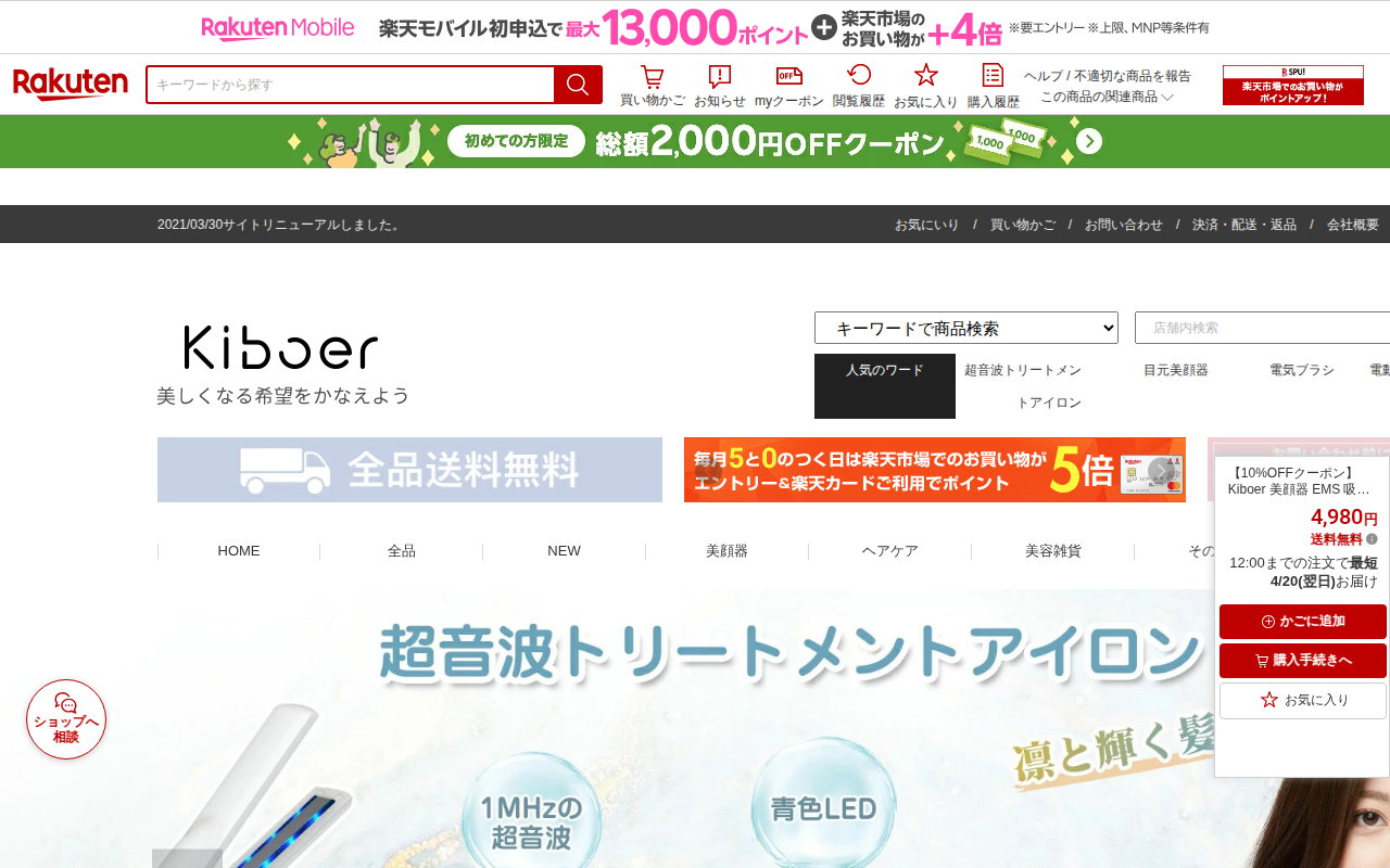 このページはKiboer社の美顔器の商品ページです。4,980円で販売されており、EMS機能、吸引機能、光エステの3つの機能を備えています。7色の光(赤、青、黄など)と3段階のレベル調整が可能で、毛穴ケアやリフトケア、保...
