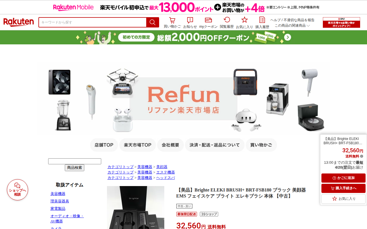このページは、楽天市場のリファン楽天市場店で販売されている中古の美顔器「Brighte ELEKI BRUSH+ BRT-FSB180」の商品情報です。価格は32,560円で送料無料、13時までの注文で翌日配送対応です。...