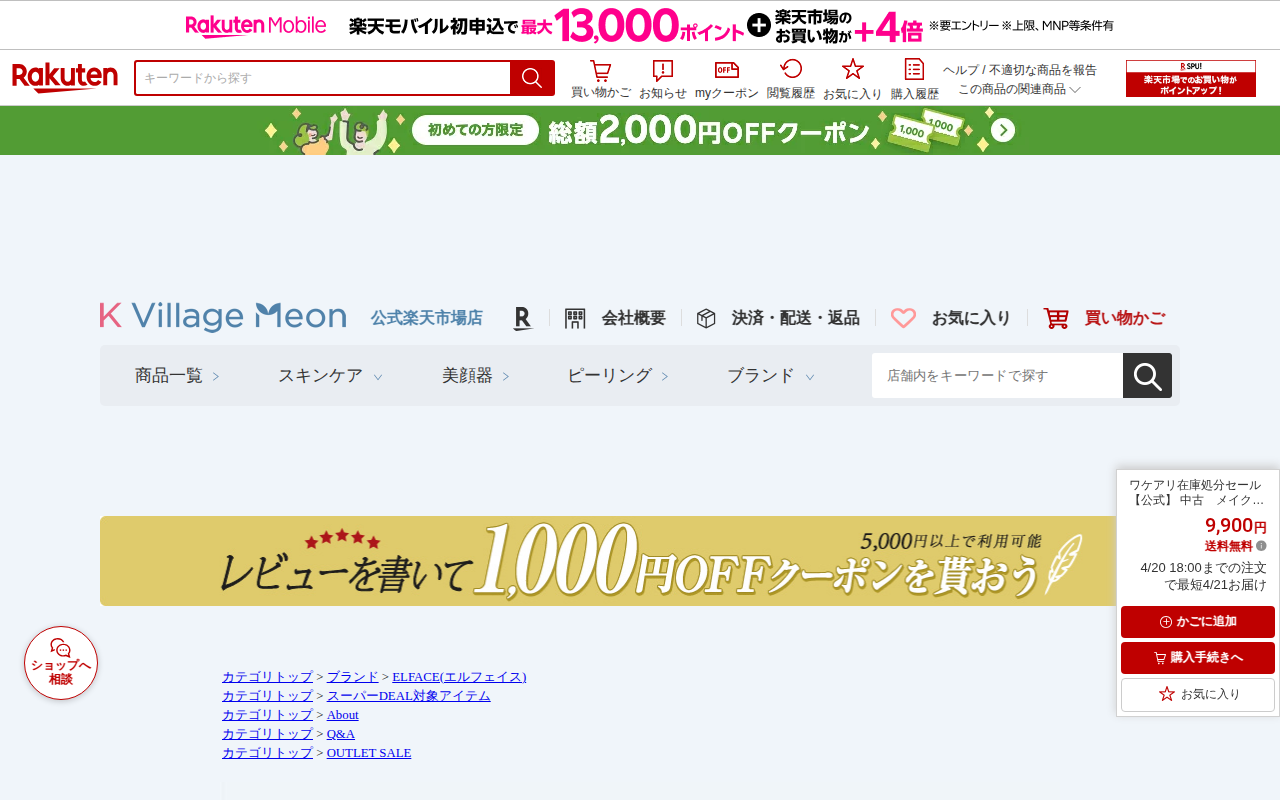 このページは、楽天市場で販売されている韓国製の美顔器「ELFACE」の商品ページです。展示品として使用された中古品を特別価格9,900円で販売しており、送料無料です。約17年間医療機器を研究してきた韓国メーカーの製品で、...