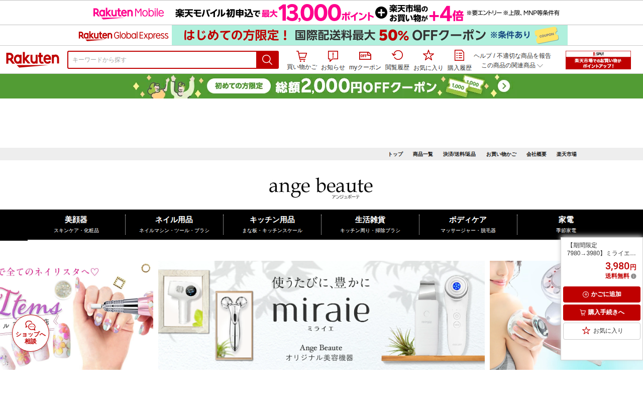 このページは、楽天市場で販売されているミライエ EMSマルチフェイシャルという美顔器の商品ページです。通常価格7,980円が期間限定で3,980円に割引されています。この製品は1台4役で、イオン導入・導出、EMS、超音波...
