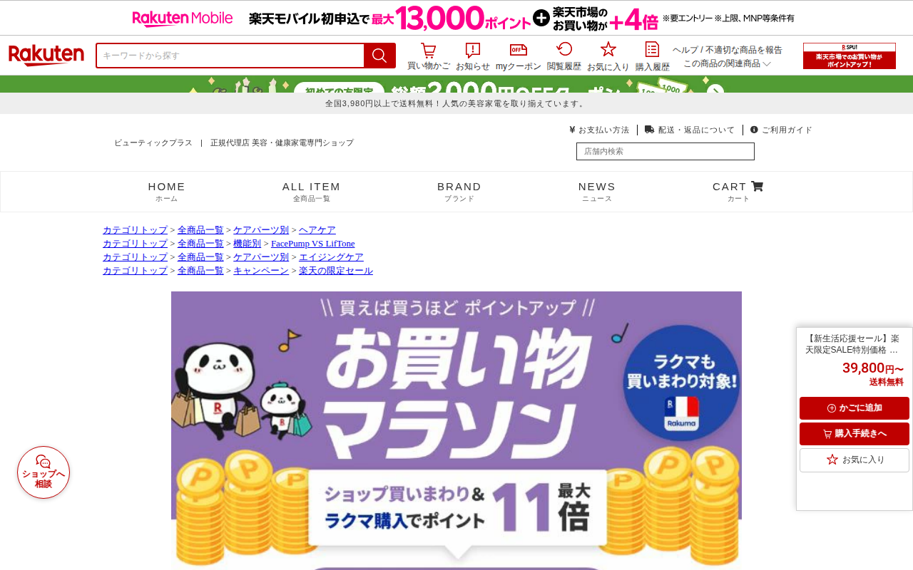 このページは、楽天市場で販売されている「LifTone(リフトーン)」というEMS美顔器の商品ページです。顔、頭皮、髪の毛のトータルケアに対応した美容機器で、EMS微電流と低周波パルスでリフトアップ、超音波キャビテーショ...