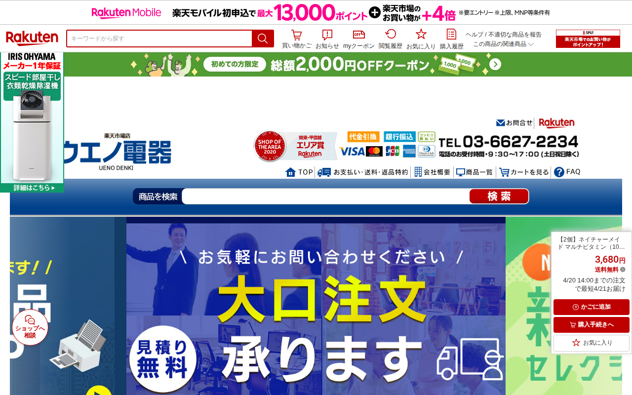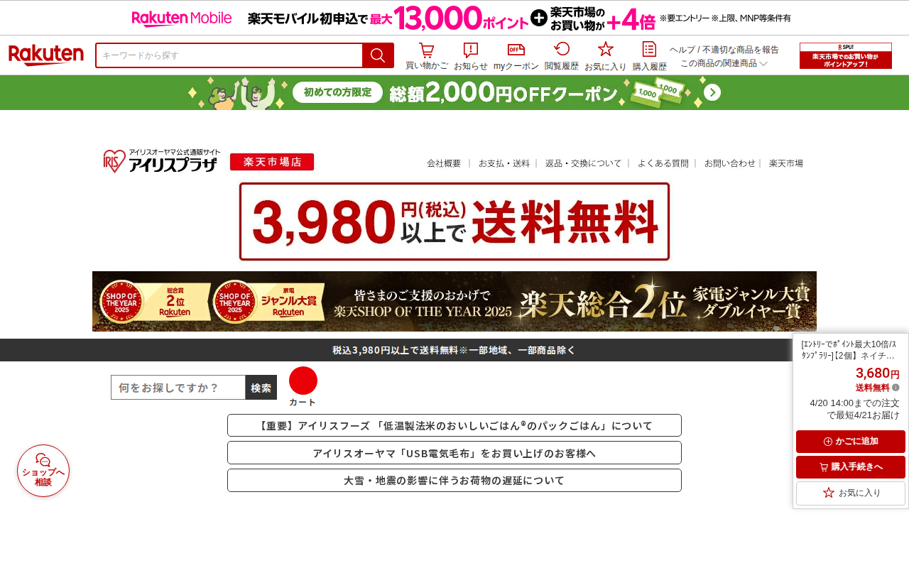 このページは、楽天市場でアイリスオーヤマ公式店が販売するネイチャーメイド マルチビタミン(100粒)の2個セット商品ページです。価格は3,680円で送料無料。1日1粒で12種類のビタミンが摂取でき、毎日無理なく続けられる...