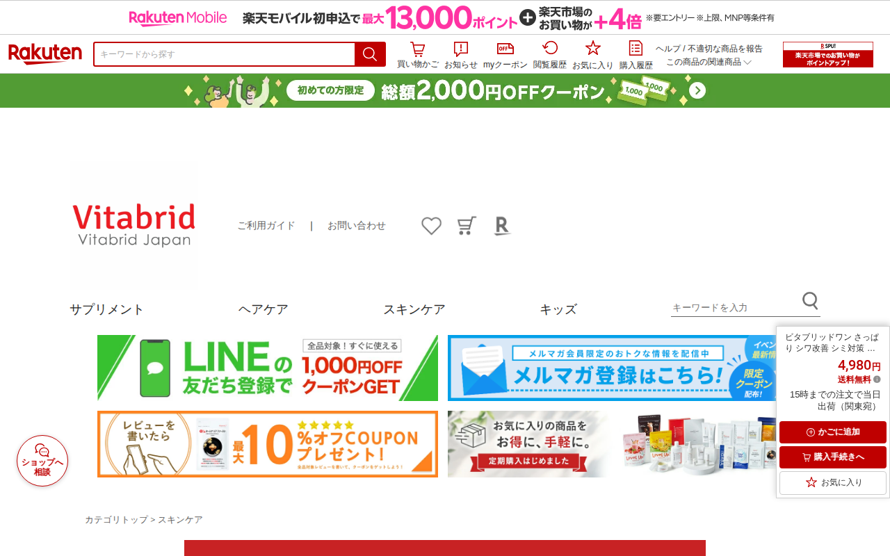 このページは、楽天市場で販売されている「ビタブリッドワン さっぱり」というオールインワン化粧品の商品ページです。ナイアシンアミドとグリチルリチン酸ジカリウムを有効成分とする薬用美容液で、シワ改善、シミ対策、保湿などの効果...