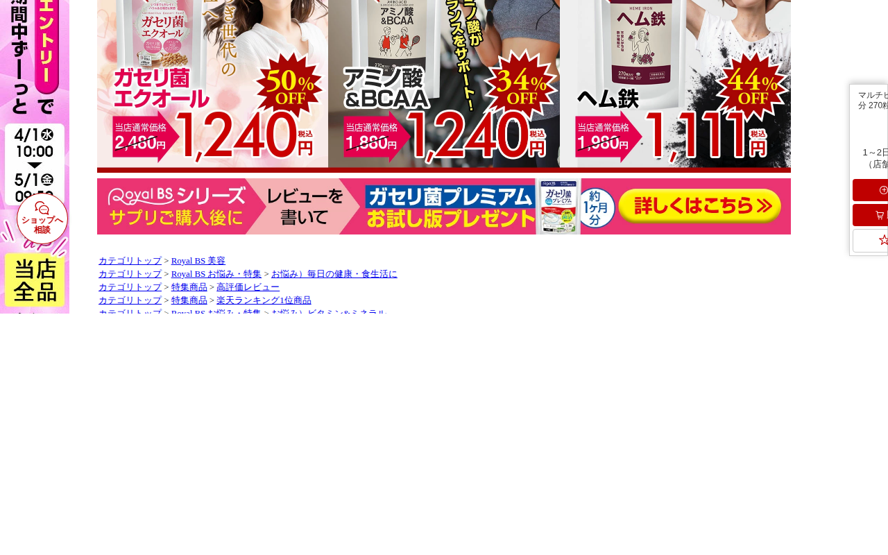このページは、楽天市場で販売されているRoyalBS公式のマルチビタミンサプリメント商品の紹介ページです。約3ヶ月分270粒入りで、ビタミンA・B・C・D・E、葉酸など11種類のビタミンを配合しています。栄養不足や野菜不...