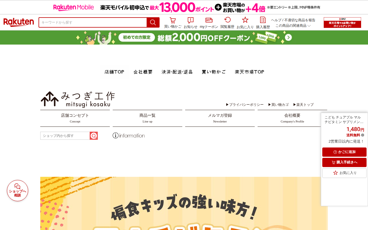 このページは、楽天市場で販売されている子ども向けチュアブルマルチビタミンサプリメントの商品ページです。60粒入りでオレンジ味、砂糖と保存料は不使用です。β-カロテンやビタミンB群、食物繊維、乳酸菌など栄養成分を含み、野菜...