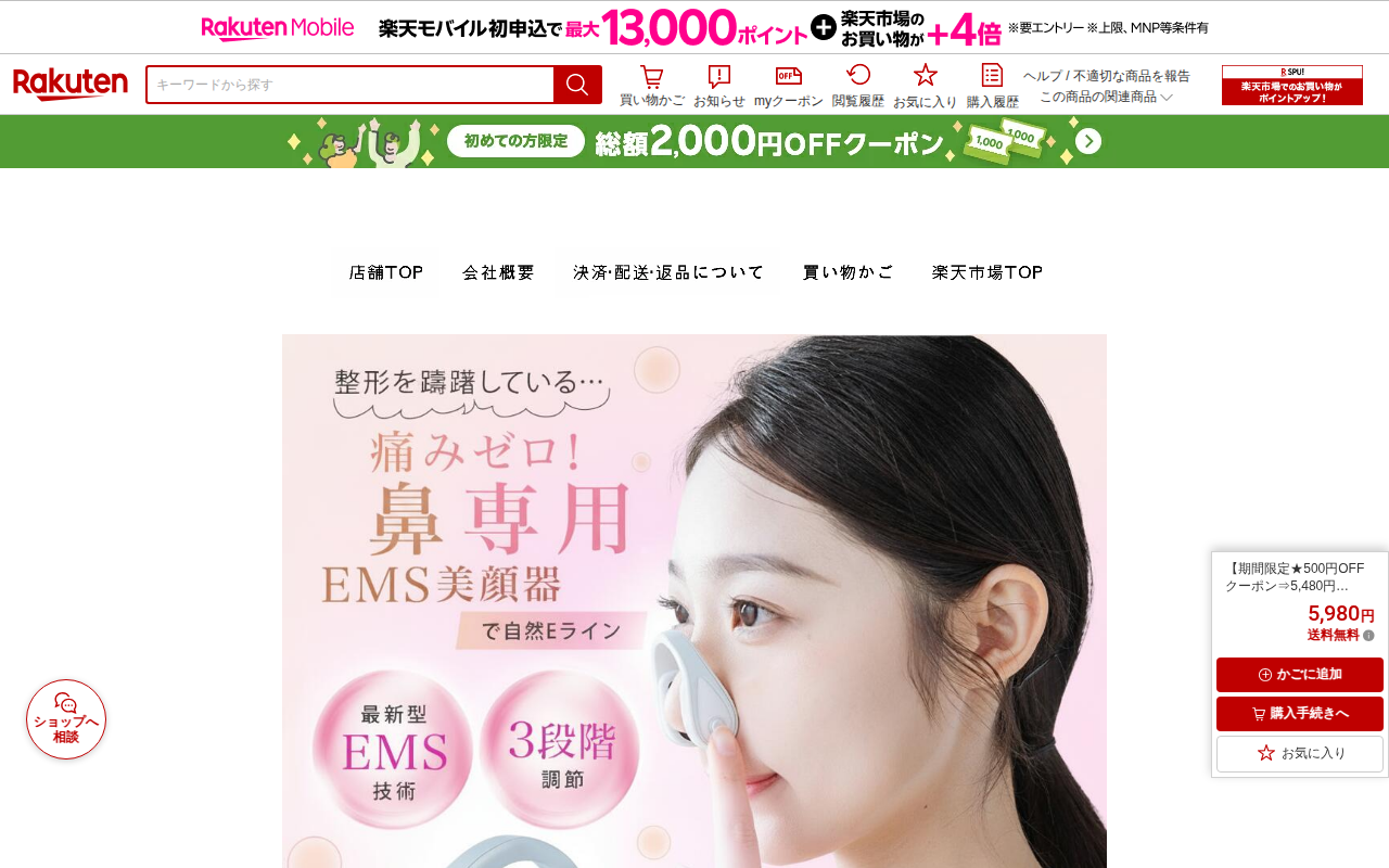 このページは、楽天市場で販売されているEMS鼻専用美顔器「nizmir nasolift」の商品ページです。低周波刺激技術により鼻周りの筋肉を鍛え、鼻筋アップや小鼻引き締めを実現します。男女兼用で敏感肌対応、充電式ワイヤ...