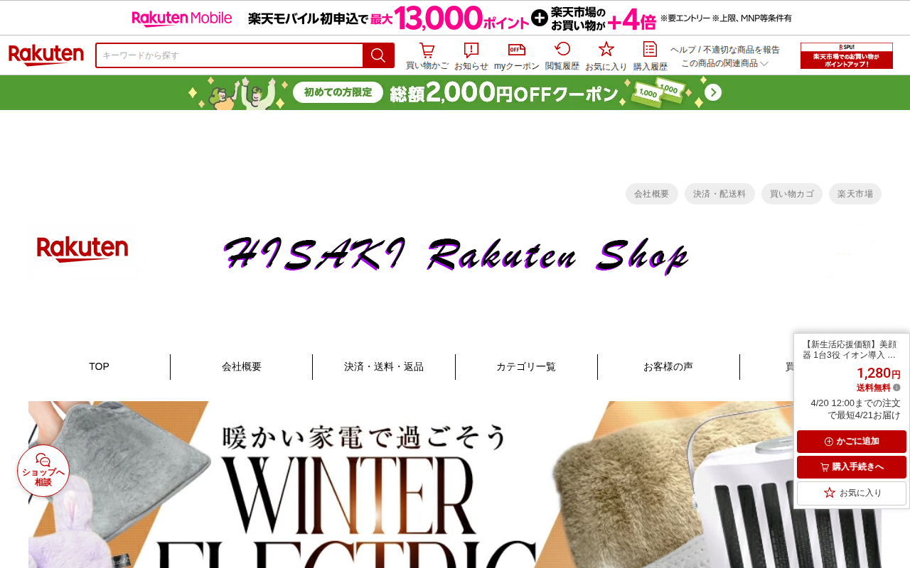 このページは、楽天市場で販売されている美顔器「ミライエ ハンディ フォー イオン」の商品紹介ページです。イオン導入、超音波振動、温熱ケアの3つの機能を搭載した複合美顔器で、価格は1,280円。送料無料で、約5~10分の使...