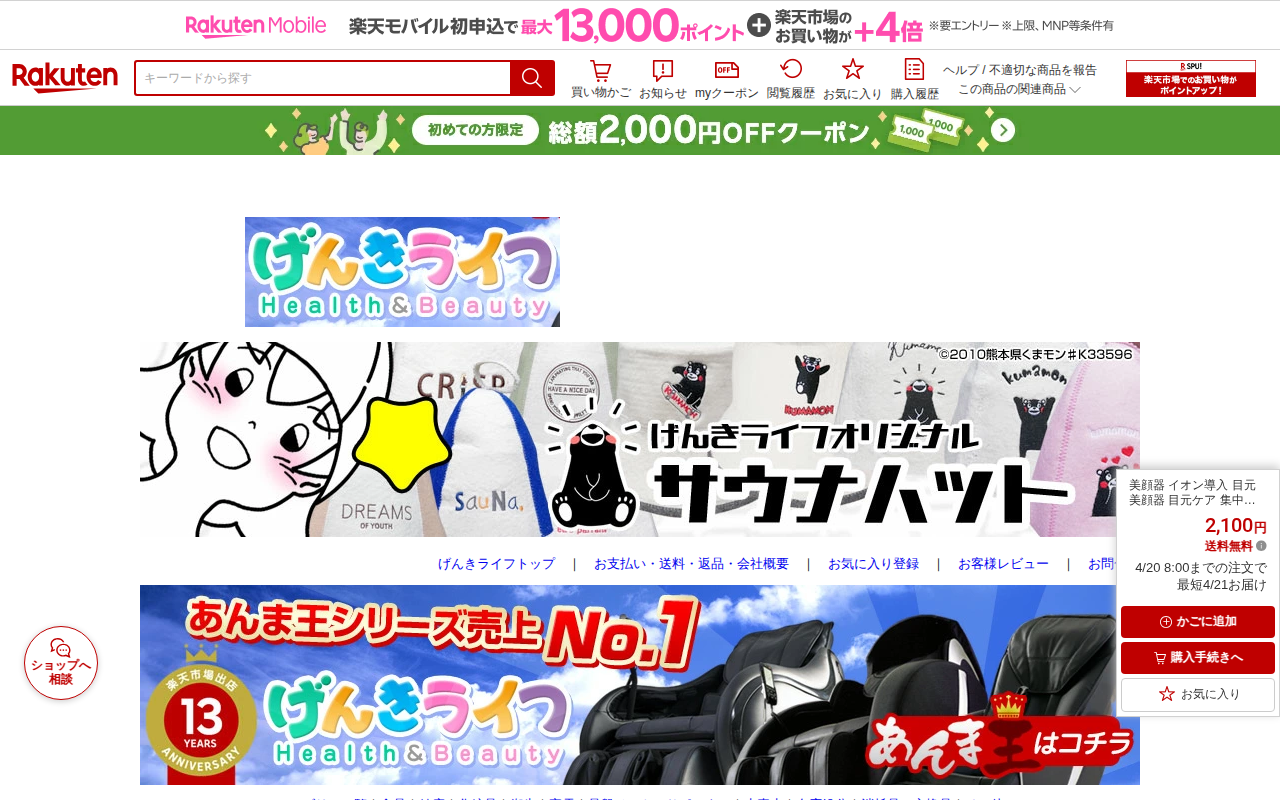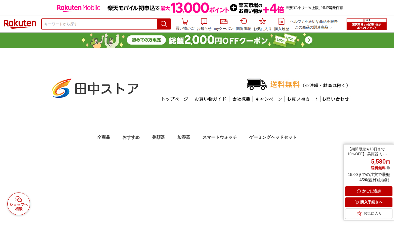 このページは、楽天市場で販売されている美顔器の商品ページです。温熱マッサージ、超音波振動、LED光エステ、イオン導入など多機能を搭載しています。42度に温まるマッサージヘッドで肌を温め、赤色と青色のライトでダブルの美肌効...