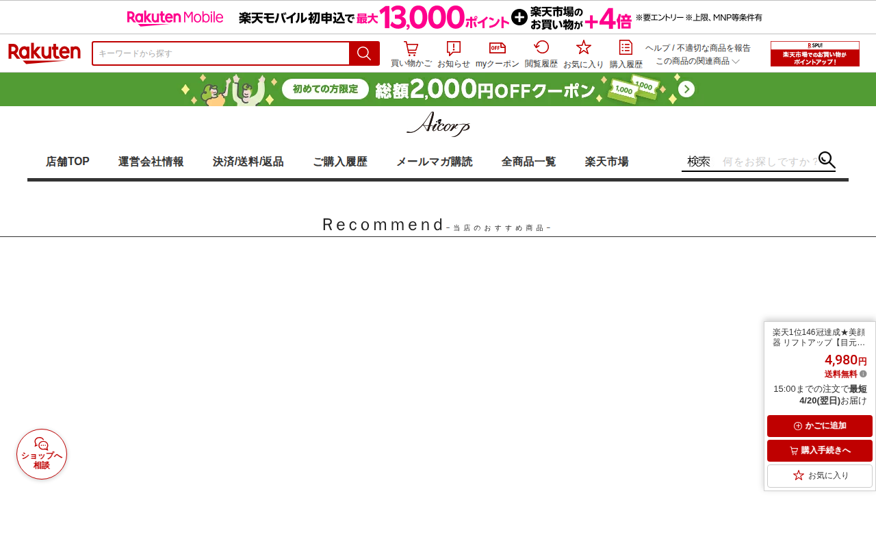このページは、楽天市場で販売されている美顔器「Aimuse」の商品ページです。楽天1位を146冠達成した人気商品で、価格は4,980円、送料無料です。温熱機能、イオン導出・導入、EMS微弱電流、目元ケア、青ライトなど8つ...