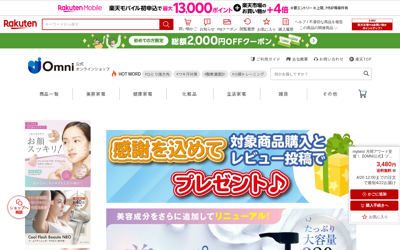 このページは、楽天市場で販売されているOMNI公式のプレミアムビューティーエステティックジェルEXの商品情報です。mybest月間アワード美顔器用ジェル部門で2位受賞した商品で、価格は3,480円、送料無料です。50種類...
