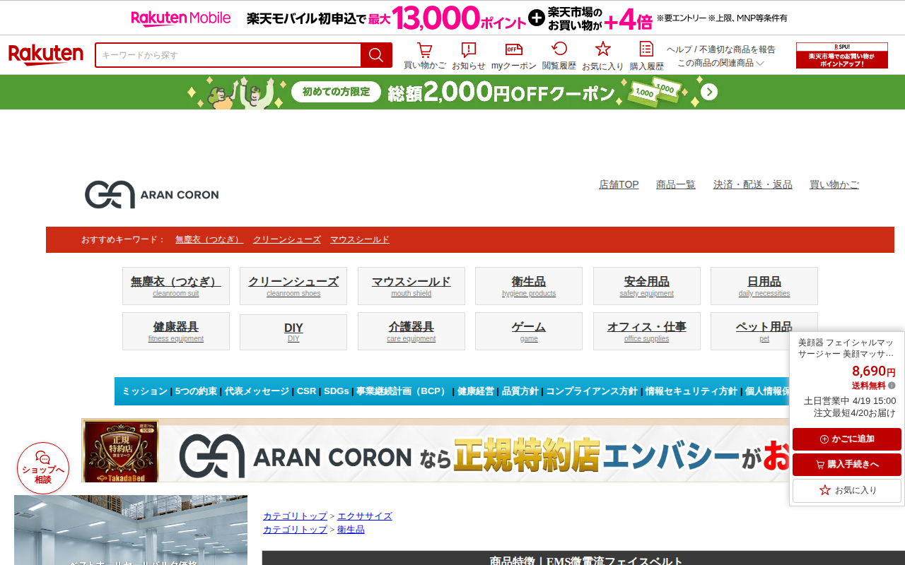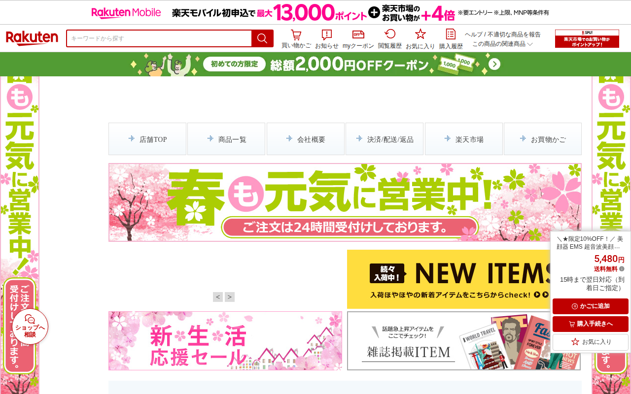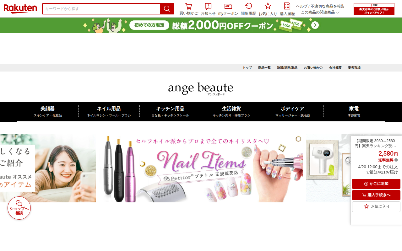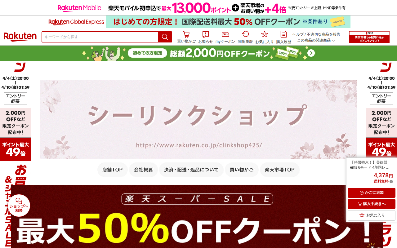 このページは、楽天市場で販売されている多機能美顔器「CI01」の商品ページです。クーポン利用で4,080円(通常4,380円)で購入できます。LED光美容、ラジオ波、EMS機能、イオン導出入、振動エステなど7つの機能を搭...