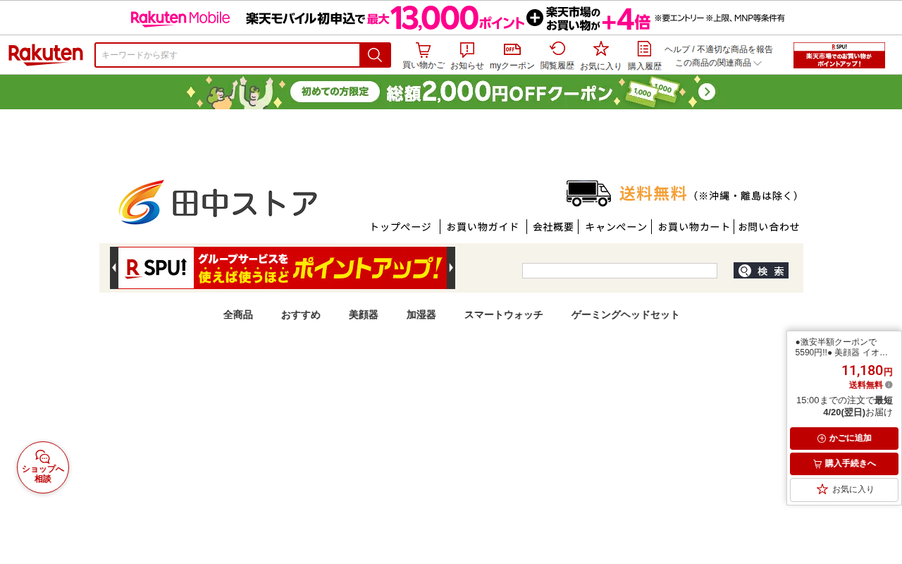 このページは、楽天市場で販売されている多機能美顔器の商品ページです。RFラジオ波、EMS、6色LED光エステを搭載した1台6役の美顔器で、通常価格12,800円が11,180円で販売されています。イオン導入・導出、温熱機...