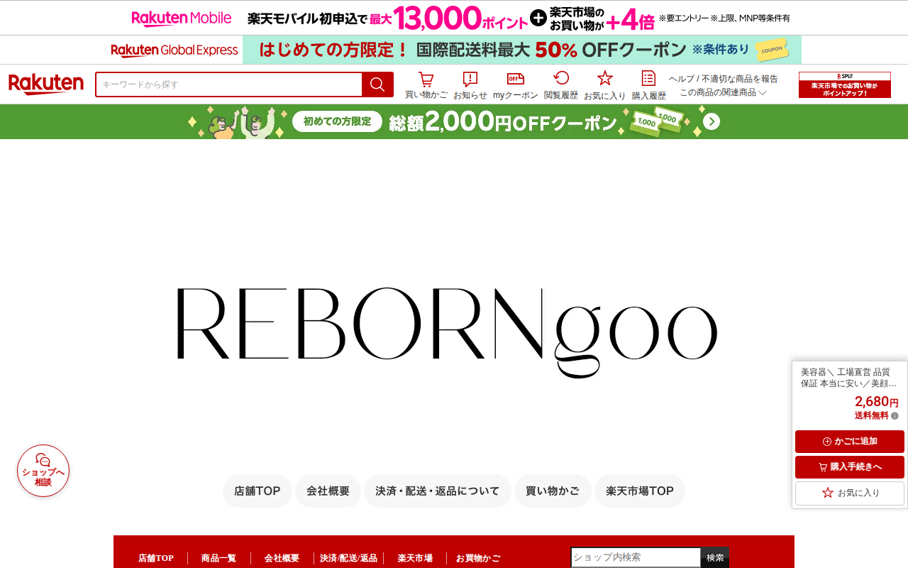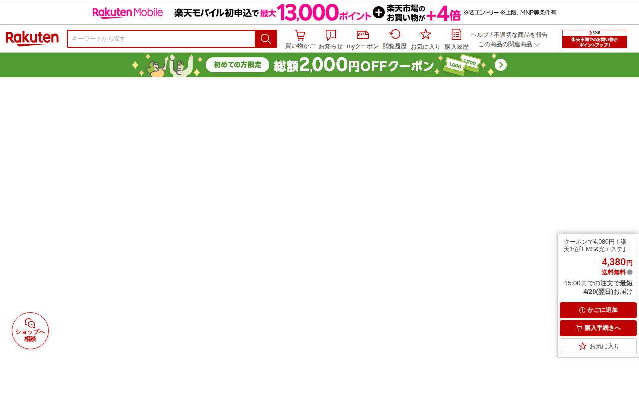 このページは、楽天市場で販売されている美容器の商品紹介ページです。工場直営で品質保証された電動カッサ美顔器で、価格は2,680円です。EMS、微電流LED光、温熱ケア機能を備え、3つの多機能モードで顔から全身まで使用でき...