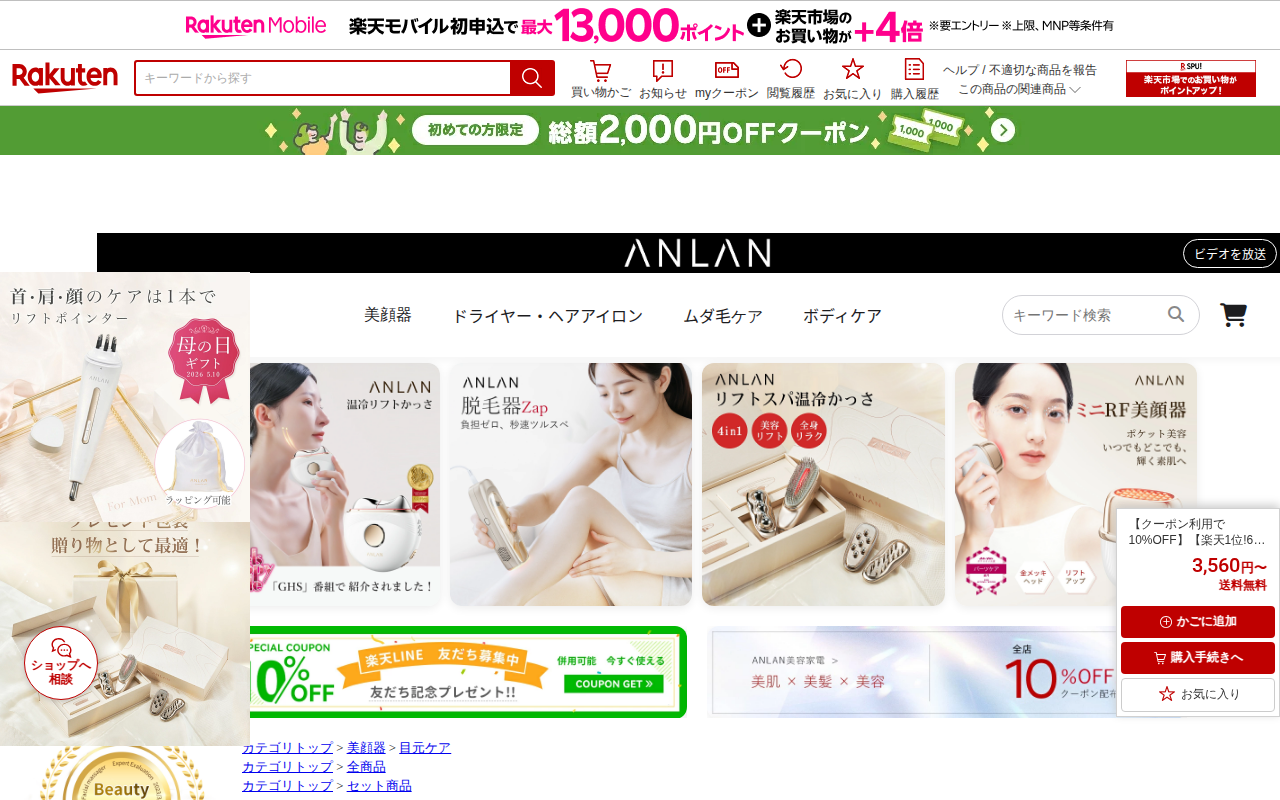 このページはANLANの目元美顔器の販売ページです。楽天市場で1位、60冠を受賞し、女性誌Ginaで紹介された商品です。EMS、温熱ケア、イオン導入、LEDフォト、振動の5つの機能を備えており、目元と口元の集中ケアが可能...