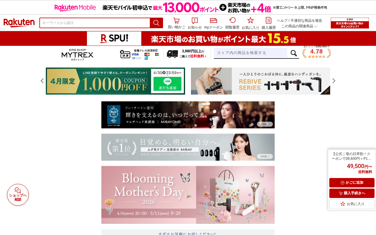 このページはMYTREX PROVE(マイトレックス プルーヴ)という美顔器の楽天市場での販売ページです。EMS機能と高出力パルスを搭載した電気ブラシで、皮膚と筋肉の両方にアプローチしてリフトケアを実現します。最大520...