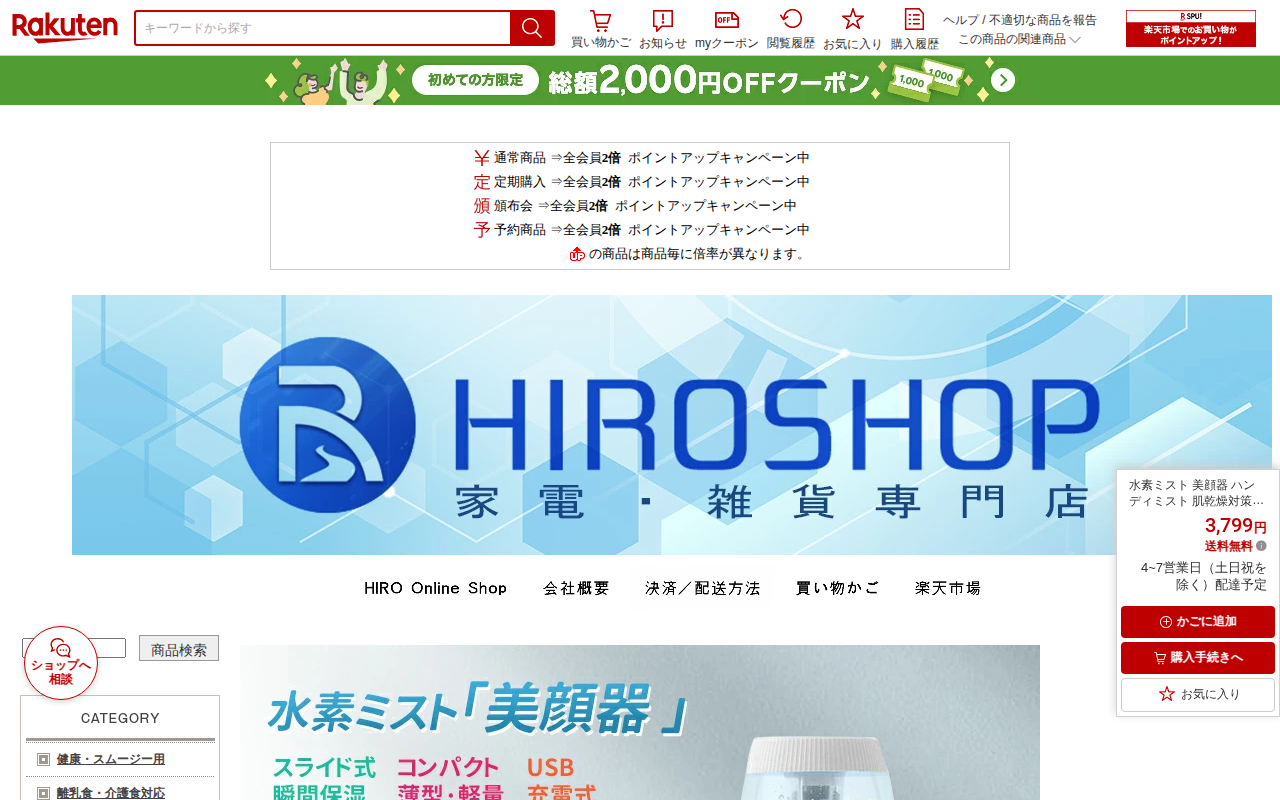 このページは、楽天市場で販売されている水素ミスト美顔器の商品紹介ページです。価格は3,799円で送料無料、4~7営業日での配達予定です。本製品は充電式のハンディミスト美顔器で、ナノ微粒化された0.3umの超微粒子バブルを...
