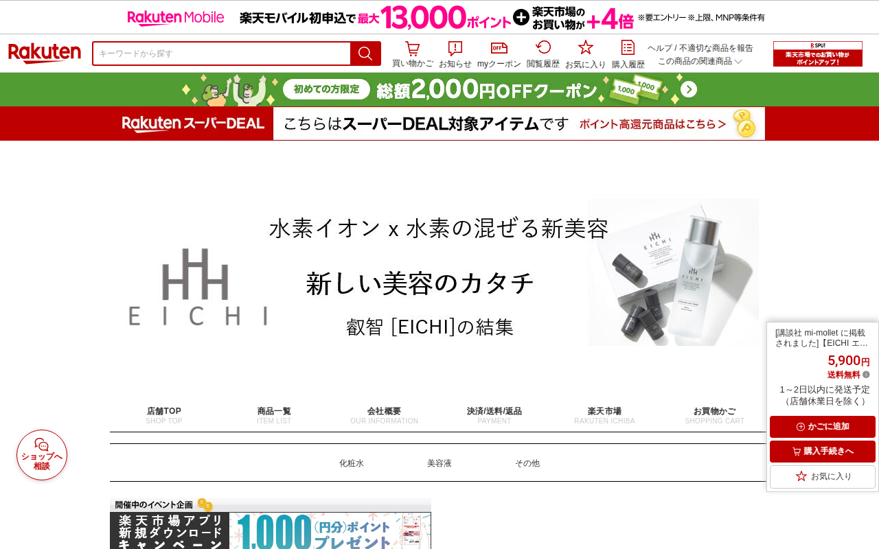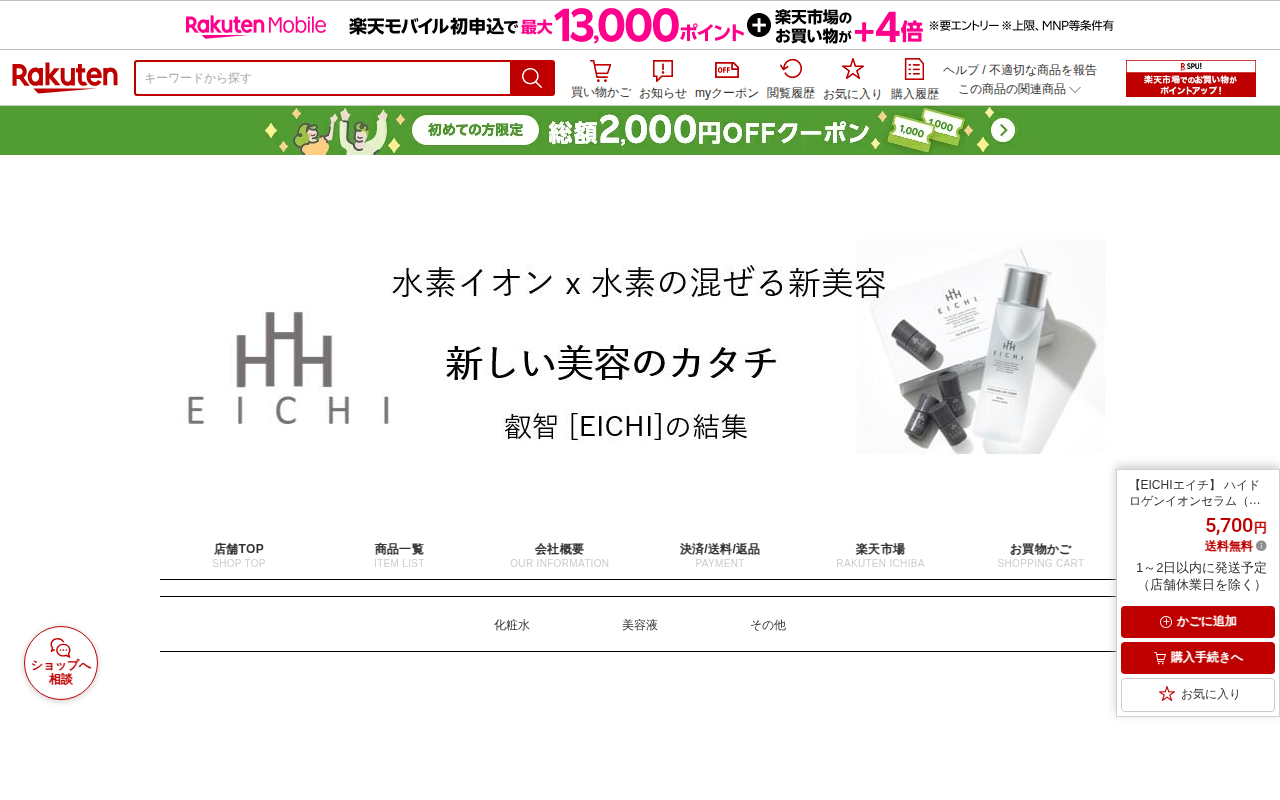 このページは、楽天市場で販売されている「EICHI エイチ」のハイドロゲンイオンセラム(水素イオン美容液)30mlの商品ページです。価格は5,900円で送料無料。講談社のmi-molletに掲載された商品で、高濃度水素イ...