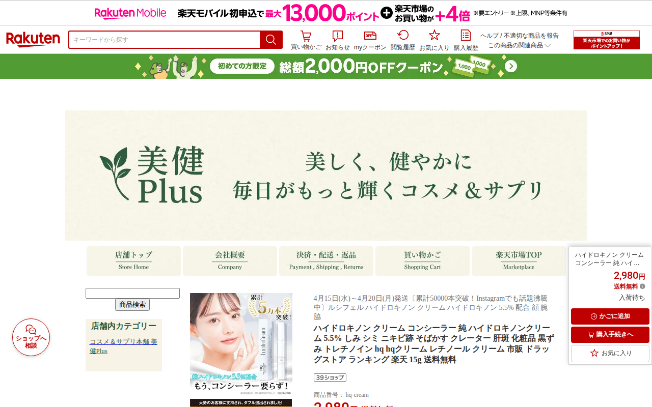【楽天市場】ハイドロキノン クリーム コンシーラー 純 ハイドロキノンクリーム 5.5% しみ シミ ニキビ跡 そばかす クレーター 肝斑 化粧品 黒ずみ トレチノイン hq hqクリーム レチノール クリーム 市販 ドラッグストア ランキング 楽天 15g 送料無料:コスメ&サプリ本舗 美健Plus