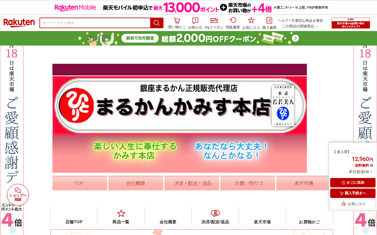 このページは、楽天市場で販売されている銀座まるかんの「水素若若美人」という水素カプセルサプリメントの商品ページです。価格は12,960円で送料無料。1日2粒を目安に摂取し、疲れた時は3~6粒飲むことが推奨されています。難...
