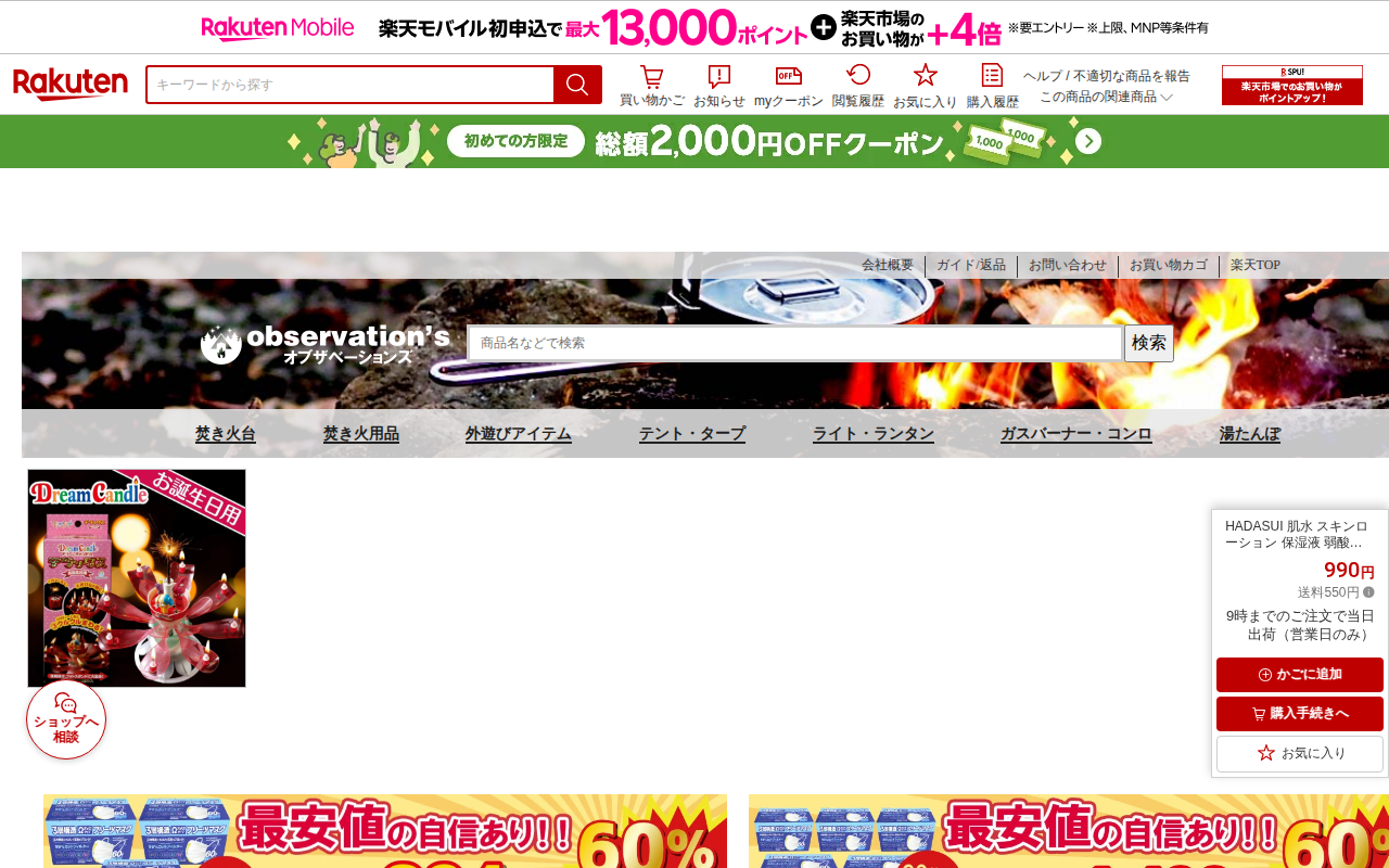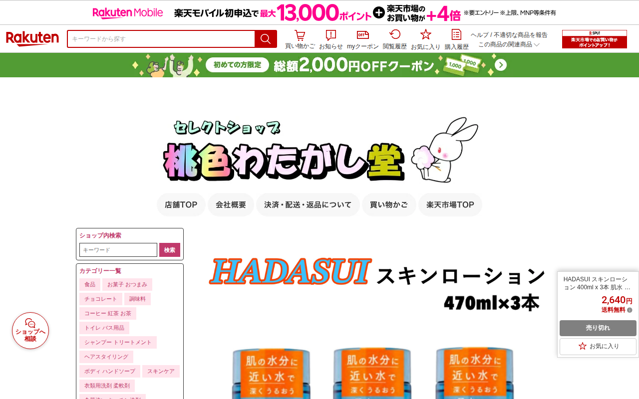 このページは、楽天市場で販売されているHADASUI肌水スキンローション400mlの商品ページです。価格は990円で送料550円。弱酸性の保湿化粧水で、無香料・無着色・アルコールフリーが特徴。肌のミネラルバランスに近いミ...